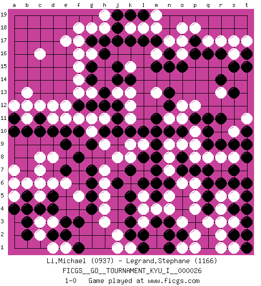 Last move : 1-0 2010 April 27 15:20:6 [Event "FICGS__GO__TOURNAMENT_KYU_I__000026"] [Site "FICGS"] [Date "2010.03.15"] [Round "1"] [Black "Li,Michael"] [White "Legrand,Stephane"] [Result "1-0"] [Rating 1 "0937"] [Rating 2 "1166"] 1.q16 c16 2.d4 q3 3.q5 r5 4.r6 r4 5.q7 o3 6.r11 o17 7.m17 r17 8.r16 q17 9.p16 o18 10.n15 p12 11.n12 o16 12.o15 m18 13.l17 l18 14.k17 e17 15.c10 d11 16.c11 c12 17.e9 d12 18.d10 f11 19.g17 k18 20.j17 f16 21.f3 h3 22.k3 h5 23.k5 h7 24.g9 j8 25.n10 o9 26.m8 r8 27.s6 r13 28.q10 q8 29.o10 s16 30.s15 s17 31.r14 f18 32.j10 d6 33.g6 h6 34.g4 h4 35.k7 l4 36.k4 c3 37.c4 d3 38.e3 j2 39.k2 k1 40.l1 j1 41.l2 e1 42.e2 d1 43.d2 c2 44.f1 b4 45.b5 f9 46.f8 g10 47.f10 h9 48.h10 g11 49.g7 k11 50.k10 l9 51.l10 k6 52.l6 m10 53.m9 n4 54.o7 m13 55.n13 p10 56.p11 p9 57.m11 o11 58.q11 o12 59.s13 b11 60.b10 a12 61.h12 j13 62.j12 k13 63.h13 h14 64.j14 h15 65.j15 k15 66.h16 m16 67.n16 n17 68.m15 g13 69.g12 f13 70.f12 e12 71.g15 f15 72.g14 f14 73.t3 s3 74.t4 p6 75.p7 o6 76.n6 p5 77.q6 p4 78.s2 r2 79.n2 p2 80.o2 n5 81.m5 n7 82.m6 n8 83.o8 n9 84.q9 p8 85.r9 s8 86.s9 t9 87.t10 h18 88.j18 g18 89.k19 s1 90.t2 m4 91.p17 p18 92.t16 t17 93.t15 s5 94.t5 c5 95.b3 b6 96.a4 c7 97.d5 c6 98.a10 b13 99.a11 b12 100.l19 m19 101.j19 k12 102.k14 h11 103.j11 e11 104.e10 t7 105.t6 s10 106.t8 t11 107.t9 l7 108.m7 l5 109.j6 n11 110.m10 a6 111.b2 g16 112.h17 o1 113.n1 p1 114.s7 h19 115.m3 k8 116.l8 k9 117.q4 f5 118.g5 e6 119.t1 r1 120.s4 r3 121.n3 a5 122.b4 f17 123.pass a7 124.pass c8 125.pass d8 126.e7 l3 127.pass pass 128.pass 1-0 Here are the names of the openings (joseki) played in the four corners : Corner q4 : q3 q5 Komoku (Somok, Xiao~mu`) 3-4 Point. The komoku (3-4) point is the traditional corner enclosure move.. Ikken Takagakari (Hankan Nop'dakeolch'im, Yi Gaogua`jiao~, 1-Space High Approach). The 5-4 approach move has become more popular in modern times, as modern Go emphasizes speed and influence. Player Black won this Go (weiqi, baduk) game. Follow this game move after move (download)The poor player plays the opponent's game for him. (Anonymous) History is a gallery of pictures in which there are few originals and many copies. (Alexis de Tocqueville)