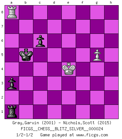 Last move : 1/2-1/2 2010 March 15 17:43:7 [Event "FICGS__CHESS__BLITZ_SILVER__000024"] [Site "FICGS"] [Date "2010.03.15"] [Round "1"] [White "Gray,Garvin"] [Black "Nichols,Scott"] [Result "1/2-1/2"] [WhiteElo "2001"] [BlackElo "2015"] 1.e4 e5 2.Nf3 Nc6 3.Bc4 Nf6 4.Ng5 Bc5 5.Bxf7+ Ke7 6.Bd5 Rf8 7.O-O d6 8.c3 Bg4 9.Qb3 h6 10.d4 Bb6 11.h3 hxg5 12.hxg4 Qd7 13.Bxc6 bxc6 14.Qd1 Qxg4 15.Qxg4 Nxg4 16.Bxg5+ Kd7 17.a4 a6 18.Be3 Rab8 19.Nd2 exd4 20.cxd4 Ba7 21.b3 Rb4 22.Rab1 Bxd4 23.Bxd4 Rxd4 24.Nc4 d5 25.exd5 cxd5 26.Rbd1 Rxd1 27.Rxd1 c6 28.f3 Kc7 29.fxg4 dxc4 30.bxc4 Rf4 31.g5 Rg4 32.Rf1 Rxg5 33.Rf7+ Kb6 34.Kf2 Rg4 35.Kf3 Rxc4 36.Rxg7 Rxa4 37.g4 Ra1 38.g5 a5 39.Rg8 a4 40.Ra8 Kb5 41.Ke4 a3 1/2-1/2 Two knights defense : Wilkes Barre (Traxler) variation Kingside Castling by player White (move 7) 10 pieces endgame at move 32 : White KRPPP , Black KRPPP WHITE : King + 1 Rook 3 Pawns BLACK : King + 1 Rook 3 Pawns 9 pieces endgame at move 35 : White KRPP , Black KRPPP WHITE : King + 1 Rook 2 Pawns BLACK : King + 1 Rook 3 Pawns 8 pieces endgame at move 36 : White KRPP , Black KRPP WHITE : King + 1 Rook 2 Pawns BLACK : King + 1 Rook 2 Pawns 7 pieces endgame at move 36 : White KRP , Black KRPP WHITE : King + 1 Rook 1 Pawn BLACK : King + 1 Rook 2 Pawns This chess game ended in a draw. Follow this game move after move (download)Mistrust is the most necessary characteristic of the Chess player. (Siegbert Tarrasch) Ich kenne keine einzige Person, die behaupten würde, Garri Kasparow sei ein guter Mensch (Nigel Short) Prefiero perder una partida realmente buena, que ganar una mala. (David Levy) Vous n'êtes pas toujours obligé de jouer le meilleur coup. Un coup doit être actif, entreprenant, correct et beau ! (David Bronstein) For to win one hundred victories in one hundred battles is not the acme of skill. To subdue the enemy without fighting is the acme of skill. (Sun Tzu)