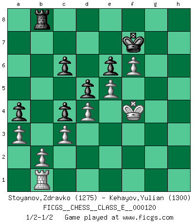 Last move : 1/2-1/2 2010 March 31 19:30:57 [Event "FICGS__CHESS__CLASS_E__000120"] [Site "FICGS"] [Date "2010.03.16"] [Round "1"] [White "Stoyanov,Zdravko"] [Black "Kehayov,Yulian"] [Result "1/2-1/2"] [WhiteElo "1275"] [BlackElo "1300"] 1.e4 d5 2.e5 Nc6 3.Bb5 Bd7 4.Bxc6 bxc6 5.d4 e6 6.Nf3 c5 7.c3 c4 8.O-O g6 9.h3 Nh6 10.Ng5 Be7 11.Nxe6 Bxe6 12.Bxh6 Bg5 13.Bxg5 Qxg5 14.Qf3 O-O 15.Na3 a6 16.Nc2 a5 17.Na3 c6 18.Rae1 Rab8 19.Rb1 Qf5 20.Qe3 Qh5 21.Rfe1 Qh4 22.Qf3 Qg5 23.Re3 Rb7 24.Qe2 R7b8 25.Rg3 Qh4 26.Nc2 Rb7 27.Ne3 Re8 28.Ng4 Bxg4 29.Rxg4 Qh6 30.Rg3 Re6 31.Rf3 Rb8 32.Rf6 Qg7 33.Qf3 Rb7 34.Qf4 a4 35.a3 Qf8 36.Rxe6 fxe6 37.Qxf8+ Kxf8 38.f4 Kg7 39.Kf2 Kf8 40.Kg3 Kg7 41.Kg4 h6 42.h4 h5+ 43.Kg5 Rf7 44.g4 hxg4 45.Kxg4 Rb7 46.Kg5 Rb8 47.h5 gxh5 48.Kxh5 Kh7 49.Kg4 Kg6 50.Kf3 Kf5 51.Kg3 Kg6 52.Kg4 Kg7 53.f5 Kf7 54.f6 Rg8+ 55.Kf4 Rb8 56.Kg5 Rg8+ 57.Kf4 Rb8 58.Kg5 Rg8+ 59.Kf4 Rb8 1/2-1/2 Scandinavian (centre counter) defense Kingside Castling by player White (move 8) Kingside Castling by player Black (move 14) This chess game ended in a draw. Follow this game move after move (download)A thorough understanding of the typical mating continuations makes the most complicated sacrificial combinations leading up to them not only not difficult, but almost a matter of course. (Siegbert Tarrasch) Ein Schachspiel besteht aus drei Phasen: Die erste, wenn du hofftst den Vorteil zu haben, die zweite, wenn du glaubst einen Vorteil zu haben, und die dritte.... wenn du weißt Du wirst verlieren. (Savielly Grigorievitsch Tartakower) Tu puedes aprender mucho mas de una partida que pierdas que de una partida ganada. Tendras que perder cientos de partidas antes de llegar a ser un buen jugador. (Jose Raul Capablanca) Mais n'est-ce pas déjà le limiter injurieusement que d'appeler les échecs un jeu? N'est-ce pas aussi une science, un art, ou quelque chose qui, comme le cercueil de Mahomet entre ciel et terre, est suspendu entre l'un et l'autre, et qui réunit un nombre incroyable de contraires ? (Stefan Zweig) They misunderestimated me. (George W. Bush, Bentonville nov. 6, 2000)