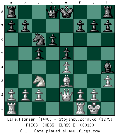 Last move : 0-1 2010 June 16 20:47:10 [Event "FICGS__CHESS__CLASS_E__000120"] [Site "FICGS"] [Date "2010.03.16"] [Round "1"] [White "Eife,Florian"] [Black "Stoyanov,Zdravko"] [Result "0-1"] [WhiteElo "1400"] [BlackElo "1275"] 1.e4 c5 2.d3 Nc6 3.Nf3 e5 4.Nc3 d6 5.Be3 Bg4 6.Be2 Nf6 7.O-O Be7 8.h3 Bh5 9.Nh4 Bxe2 10.Qxe2 Nxe4 11.dxe4 Bxh4 0-1 This chess game has been lost on time (started : 2010.03.16 13:1:20) Sicilian defense Kingside Castling by player White (move 7) Player Black won this chess game. Follow this game move after move (download)The most powerful weapon in Chess is to have the next move. (David Bronstein) Es tut gut, die Entwicklungsperiode von, [...] demokratischem Geist durchdringen zu lassen. Wie undemokratisch wäre es doch beispielsweise, den einen Offizier große Spaziertouren vornehmen zu lassen, während die anderen zu Hause säßen und sich entsetzlich langweilten. (Aaron Nimzowitsch) El Ajedrez te enseña a controlarl la excitación inicial que sientes cuando vez algo que parece bueno y te enseña a pensar objetivamente cuando te encuentras en problemas. (Stanley Kubrick) Vous m'avez demandé de vous exposer quel est le fondement de la prière. Je ne fais que préparer les pièces du jeu sur la table... Nous sera-t-il permis d'en adopter les règles et si nous les appliquons scrupuleusement nous ne tarderons pas à faire mat le Roi divin ! Il ne pourra échapper à nos mains. (Sainte Thérèse d'Avila, Chemin de perfection) Statistics can be made to prove anything - even the truth. (Author unknown)