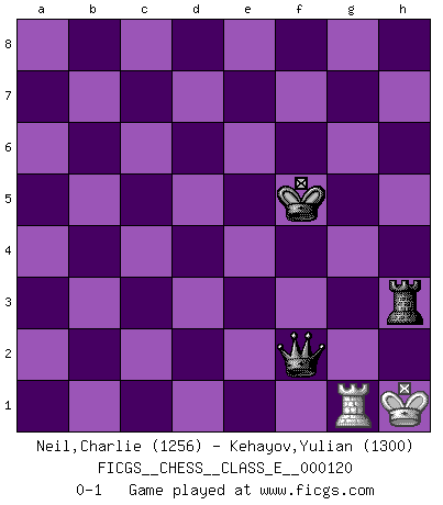 Last move : 0-1 2010 July 31 8:7:24 [Event "FICGS__CHESS__CLASS_E__000120"] [Site "FICGS"] [Date "2010.03.16"] [Round "1"] [White "Neil,Charlie"] [Black "Kehayov,Yulian"] [Result "0-1"] [WhiteElo "1256"] [BlackElo "1300"] 1.e4 e5 2.Nf3 d6 3.Nc3 Nf6 4.Bc4 Be7 5.d4 O-O 6.O-O exd4 7.Nxd4 c6 8.Qe2 d5 9.exd5 cxd5 10.Bb3 Nc6 11.Be3 Nxd4 12.Bxd4 Be6 13.Rfe1 b6 14.Bxf6 Bxf6 15.Rad1 Bxc3 16.bxc3 Qc7 17.Bxd5 Bxd5 18.Rxd5 Qxc3 19.Re5 h6 20.Qe4 Rac8 21.Qe3 Qxc2 22.g3 Qxa2 23.Qe4 Qa3 24.Qb7 Rc1 25.Rxc1 Qxc1+ 26.Kg2 Qa3 27.Re7 Qa5 28.Qxa7 Qxa7 29.Rxa7 Rb8 30.Kf1 b5 31.h4 b4 32.Ra2 Rc8 33.Rb2 Rc4 34.Ke2 Rg4 35.Kd3 g6 36.Kc2 g5 37.Kb3 gxh4 38.gxh4 Rxh4 39.Rc2 Kg7 40.Rc6 f6 41.Rc5 Kg6 42.Rd5 f5 43.Rd6+ Kg5 44.Rd8 Rf4 45.Rg8+ Kh5 46.Rg7 Rxf2 47.Kxb4 Rf4+ 48.Kc3 Rg4 49.Ra7 Kh4 50.Ra6 h5 51.Kd3 Kg3 52.Ke2 h4 53.Ra3+ Kf4 54.Kf2 Rg3 55.Ra4+ Kg5 56.Rc4 f4 57.Rb4 Kg4 58.Rb7 Kh3 59.Rb4 Kg4 60.Ra4 h3 61.Ra7 h2 62.Rh7 Rh3 63.Rg7+ Kf5 64.Rf7+ Kg6 65.Rxf4 h1Q 66.Rg4+ Kf5 67.Rg1 Qf3+ 68.Ke1 Qe3+ 69.Kf1 Rf3+ 70.Kg2 Qf2+ 71.Kh1 Rh3+ 0-1 Philidor's defense Kingside Castling by player Black (move 5) Kingside Castling by player White (move 6) 10 pieces endgame at move 37 : White KRPP , Black KRPPPP WHITE : King + 1 Rook 2 Pawns BLACK : King + 1 Rook 4 Pawns 9 pieces endgame at move 38 : White KRPP , Black KRPPP WHITE : King + 1 Rook 2 Pawns BLACK : King + 1 Rook 3 Pawns 8 pieces endgame at move 38 : White KRP , Black KRPPP WHITE : King + 1 Rook 1 Pawn BLACK : King + 1 Rook 3 Pawns 7 pieces endgame at move 46 : White KR , Black KRPPP WHITE : King + 1 Rook BLACK : King + 1 Rook 3 Pawns 6 pieces endgame at move 47 : White KR , Black KRPP WHITE : King + 1 Rook BLACK : King + 1 Rook 2 Pawns 5 pieces endgame at move 65 : White KR , Black KRP WHITE : King + 1 Rook BLACK : King + 1 Rook 1 Pawn Promotion Queen by player Black (move 65) Player Black won this chess game. Follow this game move after move (download)Chess problems demand from the composer the same virtues that characterize all worthwhile art: originality, invention, conciseness, harmony, complexity, and splendid insincerity. (Vladimir Nabokov) Der Partner hat auch seine Existenzberechtigung. (Savielly Grigorievitsch Tartakower) El Ajedrez expande y enriquece tu mente. (Saudin Robovic) Les Echecs ont trois composantes : le temps, l'espace et le matériel en dernier. (Mikhail Tal) Convictions are more dangerous enemies of truth than lies. (Friedrich Nietzsche)