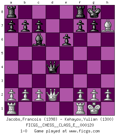Last move : 1-0 2010 March 29 11:31:13 [Event "FICGS__CHESS__CLASS_E__000120"] [Site "FICGS"] [Date "2010.03.16"] [Round "1"] [White "Jacobs,Francois"] [Black "Kehayov,Yulian"] [Result "1-0"] [WhiteElo "1398"] [BlackElo "1300"] 1.e4 d5 2.exd5 Qxd5 3.Nc3 Qd8 4.d4 e6 5.Nf3 Bd7 6.Bd3 Nf6 7.O-O Bd6 8.Ne5 Nc6 9.Nxc6 Bxc6 10.Bg5 O-O 11.Ne4 Be7 12.Nxf6+ Bxf6 13.Bxf6 Qxf6 14.Qd2 Qxd4 15.Bxh7+ 1-0 Scandinavian (centre counter) defense Kingside Castling by player White (move 7) Kingside Castling by player Black (move 10) Player White won this chess game. Follow this game move after move (download)You have to have the fighting spirit. You have to force moves and take chances. (Bobby Fischer) Ein Isolani verdüstert die Stimmung auf dem ganzen Schachbrett. (Savielly Grigorievitsch Tartakower) El Ajedrez es 99 por ciento táctica. (Teichmann) Il vaut toujours mieux jouer un plan faux de façon logique que de n'avoir pas de plan du tout. (Victor Kortchnoï) Mac users swear by their computers. PC users swear at their computers. (Author unknown)