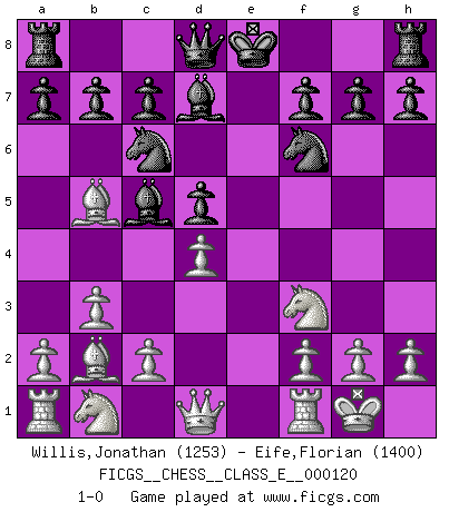 Last move : 1-0 2010 May 23 7:50:2 [Event "FICGS__CHESS__CLASS_E__000120"] [Site "FICGS"] [Date "2010.03.16"] [Round "1"] [White "Willis,Jonathan"] [Black "Eife,Florian"] [Result "1-0"] [WhiteElo "1253"] [BlackElo "1400"] 1.b3 e5 2.Bb2 Nc6 3.Nf3 Nf6 4.e3 d5 5.Bb5 Bd7 6.O-O Bc5 7.d4 exd4 8.exd4 1-0 This chess game has been lost on time (started : 2010.03.16 13:1:20) Nimzovich-Larsen attack : Modern variation Kingside Castling by player White (move 6) Player White won this chess game. Follow this game move after move (download)Chess is ruthless: you've got to be prepared to kill people. (Nigel Short) Frage des Reporters: -Welche besonderen Umstände rechtfertigen das Anhalten der Uhren während einer Turnierpartie? Antwort: -Einen Fotographen zu strangulieren. (Siegbert Tarrasch) Cuando tengo las piezas blancas, yo gano porque soy blanco; Cuando tengo las piezas negras, yo gano porque soy Bogolyubov. (Bogolyubov) Comme les marins qui ont mille raisons différentes d'aller en mer, les joueurs d'échecs en ont tout autant avant de s'installer devant une table et jouer... (Vincent Bertignac, philosophe) I take risks, sometimes patients die, but not taking risks causes more patients to die. So I guess my biggest problem is I've been cursed with the ability to do the math. (Gregory House, House M.D.)