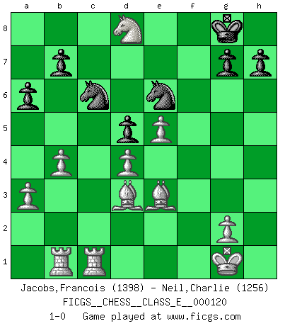 Last move : 1-0 2010 June 9 23:9:17 [Event "FICGS__CHESS__CLASS_E__000120"] [Site "FICGS"] [Date "2010.03.16"] [Round "1"] [White "Jacobs,Francois"] [Black "Neil,Charlie"] [Result "1-0"] [WhiteElo "1398"] [BlackElo "1256"] 1.e4 e6 2.d4 d5 3.Nd2 Nf6 4.e5 Nfd7 5.Bd3 c5 6.c3 cxd4 7.cxd4 Nc6 8.Ne2 Be7 9.f4 O-O 10.Nf3 a6 11.O-O Qb6 12.a3 f5 13.Qc2 Rd8 14.Be3 Nf8 15.Rab1 Bd7 16.Rfc1 Rac8 17.Qd1 Rc7 18.b4 Be8 19.Ng3 Rdc8 20.Nxf5 Bh5 21.Ng3 Bg6 22.f5 exf5 23.Nxf5 Bxf5 24.Bxf5 Rd8 25.h4 Bxh4 26.Nxh4 Rf7 27.Qg4 Qc7 28.Bd3 Qe7 29.Nf5 Qe6 30.Nh6+ Kh8 31.Qxe6 Nxe6 32.Nxf7+ Kg8 33.Nxd8 1-0 French : Tarrasch, Closed variation Kingside Castling by player Black (move 9) Kingside Castling by player White (move 11) Player White won this chess game. Follow this game move after move (download)Openings teach you openings. Endgames teach you chess ! (Stephan Gerzadowicz) Es ist besser die Steine des Gegners zu opfern. (Savielly Grigorievitsch Tartakower) La vida es como el Ajedrez, con lucha, competición y eventos buenos y malos. (Benjamin Franklin) Fischer est le meilleur joueur du monde et Karpov n'est qu'un joueur de bistrot. (Garry Kasparov, agé de 16 ans) Crush them ! Make them suffer ! (General Grievous in Star Wars ep.3)