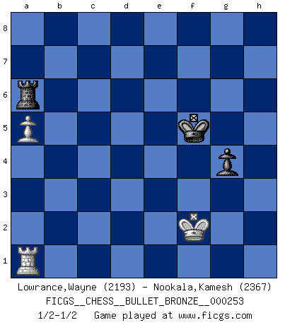 Last move : 1/2-1/2 2010 April 25 20:19:18 [Event "FICGS__CHESS__BULLET_BRONZE__000253"] [Site "FICGS"] [Date "2010.04.25"] [Round "1"] [White "Lowrance,Wayne"] [Black "Nookala,Kamesh"] [Result "1/2-1/2"] [WhiteElo "2193"] [BlackElo "2367"] 1.e4 c5 2.Nf3 d6 3.d4 cxd4 4.Nxd4 Nf6 5.Nc3 a6 6.Be3 e5 7.Nb3 Be6 8.f3 Be7 9.Qd2 O-O 10.O-O-O Nbd7 11.g4 b5 12.g5 b4 13.Ne2 Ne8 14.f4 a5 15.f5 a4 16.Nbd4 exd4 17.Nxd4 b3 18.Kb1 bxc2+ 19.Nxc2 Bb3 20.axb3 axb3 21.Na3 Ne5 22.h4 Ra4 23.Bd4 Nf3 24.Qc3 Nxd4 25.Rxd4 Rxd4 26.Qxd4 d5 27.Qxd5 Qb6 28.Bc4 Bxa3 29.bxa3 Nd6 30.g6 hxg6 31.fxg6 Nxc4 32.gxf7+ Rxf7 33.Qxc4 Qf2 34.Qxb3 Kh7 35.Rd1 Rf4 36.e5 Rxh4 37.Qc2+ Qxc2+ 38.Kxc2 Re4 39.Ra1 Rxe5 40.a4 Ra5 41.Kb3 g5 42.Kb4 Ra7 43.a5 Kg6 44.Kc5 Ra6 45.Kb5 Ra7 46.Kc4 g4 47.Kd4 Kf5 48.Ke3 Ra6 49.Kf2 1/2-1/2 Sicilian : Najdorf, Byrne (English) attack Kingside Castling by player Black (move 9) Queenside Castling by player White (move 10) 10 pieces endgame at move 34 : White KQRPPP , Black KQRP WHITE : King + 1 Queen 1 Rook 3 Pawns BLACK : King + 1 Queen 1 Rook 1 Pawn 9 pieces endgame at move 36 : White KQRPP , Black KQRP WHITE : King + 1 Queen 1 Rook 2 Pawns BLACK : King + 1 Queen 1 Rook 1 Pawn 8 pieces endgame at move 37 : White KRPP , Black KQRP WHITE : King + 1 Rook 2 Pawns BLACK : King + 1 Queen 1 Rook 1 Pawn 7 pieces endgame at move 38 : White KRPP , Black KRP WHITE : King + 1 Rook 2 Pawns BLACK : King + 1 Rook 1 Pawn 6 pieces endgame at move 39 : White KRP , Black KRP WHITE : King + 1 Rook 1 Pawn BLACK : King + 1 Rook 1 Pawn This chess game ended in a draw. Follow this game move after move (download)I love all positions. Give me a difficult positional game, I will play it. But totally won positions, I cannot stand them. (Hein Donner) Fischer ist das größte Genie, das je vom Schachhimmel heruntergestiegen ist. (Mikhail Nekhemyevich Tal) El pensamiento metódico es mas útil en el Ajedrez que la inspiración. (C. J. S. Purdy) Aux échecs, les retours au sommet sont rares : les dommages psychologiques consécutifs à une défaite sont trop sévères. (Daily Telegraph) Cactus - It is depressed cucumber. (Ilmars Cirulis)