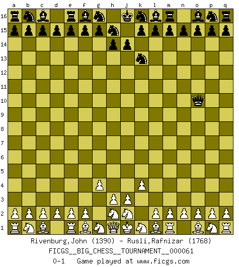 Last move : 0-1 2010 May 11 19:51:15 [Event "FICGS__BIG_CHESS__TOURNAMENT__000061"] [Site "FICGS"] [Date "2010.03.18"] [Round "1"] [White "Rivenburg,John"] [Black "Rusli,Rafnizar"] [Result "0-1"] [WhiteElo "1390"] [BlackElo "1768"] 1.k2-k4 j15-k13 2.g2-g4 h16-o10 0-1 This big chess game has been lost on time (started : 2010.03.18 11:20:10) Follow this game move after move (download)A chess genius has died; a loss for humanity. (Viktor Kortchnoi, about Bobby Fischer's death) Ich moechte nie einem Club beitreten, der Leute wie mich als Mitglieder aufnimmt. (Woody Allen) La maestría del Ajedrez consiste esencialmente en analizar posiciónes de Ajedrez con precisión. (Mikhail Botvinnik) Pour se monter efficace, un Cavalier a besoin d'avant-postes ! Les Cavaliers font les meilleurs bloqueurs de pions passés. When the going gets tactical, the computers get going. (Hyatt)