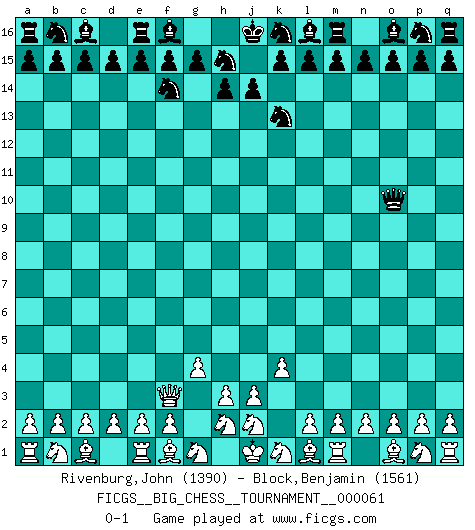 Last move : 0-1 2010 April 22 9:22:33 [Event "FICGS__BIG_CHESS__TOURNAMENT__000061"] [Site "FICGS"] [Date "2010.03.18"] [Round "1"] [White "Rivenburg,John"] [Black "Block,Benjamin"] [Result "0-1"] [WhiteElo "1390"] [BlackElo "1561"] 1.g2-g4 j15-k13 2.k2-k4 h16-o10 3.h1-f3 g16-f14 0-1 This big chess game has been lost on time (started : 2010.03.18 11:20:10) Follow this game move after move (download)The game of Chess is not merely an idle amusement; several very valuable qualities of the mind are to be acquired and strengthened by it, so as to become habits ready on all occasions; for life is a kind of Chess. (Benjamin Franklin) Dass jemand wie Surab Asmaiparaschwili, der selbst Elopunkte gekauft hat , Vize-Präsident der Fide werden konnte, sagt schon einges über den Zustand dieser Organisation aus. (Joel Lautier) El Ajedrez por encima de todo... ¡es una pelea!. (Emanuel Lasker) Psychologiquement, tu dois avoir confiance en toi même, mais cette confiance doit être basée sur des faits. (Robert Fischer) Only sick music makes money today. (Friedrich Nietzsche)