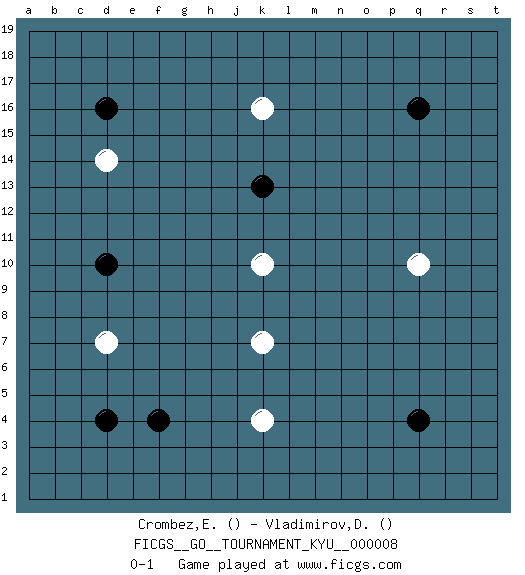 Last move : 0-1 2006 November 28 22:12:37 [Event "FICGS__GO__TOURNAMENT_KYU__000008 "] [Site "FICGS"] [Date "2006.10.19"] [Round "1"] [Black "Crombez,Etienne "] [White "Vladimirov,Dimitar "] [Result "0-1"] 1.q16 k10 2.q4 q10 3.d16 k16 4.d4 k4 5.d10 k7 6.k13 d7 7.f4 d14 0-1 This go game has been lost on time (started : 2006.10.19 17:19:28) Here are the names of the openings (joseki) played in the four corners : Corner d4 : d4 d7Hoshi (Hwajeom, Seongjeom, Xingwei`) 4-4 Point. The star or hoshi (4-4) point, emphasizing influence at the potential expense of territory.Nikken Takagakari (Dukan Nop'dakeolch'im, E`r Gaojia, 2-Space High Approach). White 2 is a light approach move. Rarely played in even games, White 2 is typically employed in handicap games. Black continues with 6-4 or 3-10. In Korean Sunjang Baduk Black has a stone on 8-4. Corner d16 : d16 d14Hoshi (Hwajeom, Seongjeom, Xingwei`) 4-4 Point. The star or hoshi (4-4) point, emphasizing influence at the potential expense of territory.Ikken Takagakari (Hankan Nop'dakeolch'im, Yi Gaojia, 1-Space High Approach). Black typically responds at 6-4 or 3-10. Black 4-10 is played when Black finds play on the right side advantageous. Black 4-8 or 3-8 may be played when Black has support at top. Player White won this Go (weiqi, baduk) game.Follow this game move after move (download ) Five liberties for tactical stability. (Anonymous) We're missing something. (Gregory House, House M.D.)