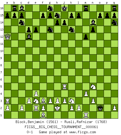 Last move : 0-1 2010 August 14 10:37:54 [Event "FICGS__BIG_CHESS__TOURNAMENT__000061"] [Site "FICGS"] [Date "2010.03.18"] [Round "1"] [White "Block,Benjamin"] [Black "Rusli,Rafnizar"] [Result "0-1"] [WhiteElo "1561"] [BlackElo "1768"] 1.j2-k4 j15-k13 2.m2-m4 h16-o10 3.h2-g4 h15-g13 4.d2-d3 e15-e13 5.p1-o3 o10-j10 6.l1-o4 f16-b12 7.k4-l6 j10-k9 8.b1-c3 k9-o9 9.o4-m2 b12-m2 10.k1-m2 o9-l6 11.h1-k3 d15-d13 12.o3-n5 l6-l7 13.n2-n3 m15-m13 14.c1-h6 n15-n13 15.o1-j6 k16-h15 16.e2-e4 l7-m8 17.h6-j5 m8-b8 18.j5-g3 b8-b2 19.g3-e5 m13-m12 20.k3-a12 b16-c14 21.g4-e3 b2-b7 22.a1-b1 b7-d7 23.g1-f3 a16-b16 24.m2-k3 p16-q14 25.m1-m3 d7-c8 26.j6-g4 c8-e10 27.m3-l3 e16-e14 28.q1-m1 e14-f14 29.l3-l5 o16-g9 30.l5-l7 f14-f3 31.g4-f3 e10-e5 32.g2-g3 e5-c3 33.e1-e2 g9-d12 34.b1-b3 c3-h8 35.l7-l5 l16-n14 36.b3-a3 h8-j8 37.l5-j5 j8-p2 38.j1-h2 p2-o2 0-1 This big chess game has been lost on time (started : 2010.03.18 11:20:10) Follow this game move after move (download)The only thing Chess players have in common is Chess. (Lodewijk Prins) Garry Kasparov war erst in der Großmeister-Organisation GMA, dann in der Profischach-Vereinigung PCA, zum Schluss kehrte er wieder in den Schoß der FIDE zurück. Aber gut, manche Leute sind flexibel (Viswanathan Anand) Ciertamente, de todas la drogas del mundo, el Ajedrez debe ser el mas placentero permamentemente. (Assiac) Les Echecs ne sont pas pour les âmes timides. Ils requièrent un homme entier, qui ne s'arrête pas aveuglément à ce qui a été déjà établi, mais qui tente individuellement de sonder les profondeurs du jeu. (W. Steinitz) Your best chance to get a Royal Flush in a casino is in the bathroom. (Anonymous)