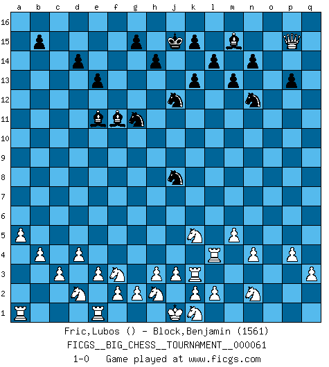 Last move : 1-0 2010 July 25 19:23:40 [Event "FICGS__BIG_CHESS__TOURNAMENT__000061"] [Site "FICGS"] [Date "2010.03.18"] [Round "1"] [White "Fric,Lubos"] [Black "Block,Benjamin"] [Result "1-0"] [WhiteElo ""] [BlackElo "1561"] 1.n2-n3 j15-k13 2.j2-h4 m15-m13 3.h1-o7 h15-g13 4.o7-o15 p16-o14 5.o1-g8 n15-n14 6.g8-f9 l15-l14 7.f9-k13 j14-k13 8.o15-l15 m16-m14 9.l15-g11 b16-c14 10.d2-d3 d15-d14 11.c1-n11 h16-h15 12.g11-l15 l16-m15 13.n11-o12 g13-j14 14.l15-f10 g16-f14 15.f10-m16 q16-p16 16.o12-m14 o16-m14 17.m16-c7 m14-l15 18.c7-c9 h15-e12 19.o2-o3 l15-m14 20.g1-f3 m14-n13 21.c2-c3 k16-h15 22.m2-m4 c16-g12 23.n3-n4 a15-a13 24.m1-m3 a16-a14 25.m4-m5 a14-b14 26.b2-b4 b14-b9 27.c9-d8 b9-d9 28.d8-n8 o14-n12 29.n8-f15 g12-h13 30.f15-b11 d9-b9 31.b11-j11 n13-m14 32.j11-k10 b9-k9 33.k10-k9 m14-n13 34.d3-d4 e12-k12 35.k9-b9 k12-b12 36.b9-o9 j16-j15 37.l1-m2 e15-e13 38.m2-b12 a13-b12 39.e2-e3 e16-a16 40.f1-d3 j14-l13 41.b1-d2 f16-e15 42.m3-k3 a16-a11 43.a2-a4 p16-a16 44.a4-a5 a11-a9 45.o9-q7 p15-p13 46.d3-n12 l13-n12 47.p1-n2 f14-g12 48.q1-m1 a9-p9 49.p2-p4 a16-a10 50.q7-q8 n13-m12 51.q8-q15 h15-k14 52.q15-q8 e15-k10 53.m1-m4 p9-p4 54.q8-j8 k14-j12 55.o3-p4 g12-h10 56.j8-d13 h13-f11 57.d13-a10 k10-h8 58.m4-l4 c14-d12 59.a10-f15 j15-h15 60.f15-c15 d12-f13 61.c15-c9 f11-e10 62.h4-k5 h8-e11 63.c9-e9 f13-g11 64.e9-b12 m12-j9 65.q2-q3 h10-j8 66.b12-b9 h15-j15 67.b9-j9 e10-f11 68.j9-p15 1-0 Follow this game move after move (download)Excellence at Chess is one mark of a scheming mind. (Sir Arthur Conan Doyle) Wenn Du nicht kämpfst, um anderen etwas zu beweisen, sondern nur für Dich selbst, dann bist du fast unbesiegbar. (Garry Kasparov) Cuando tengas duda... ¡juega al Ajedrez!. (Tevis) La vie est comme un jeu d'échecs : nous esquissons un plan, mais celui-ci est tributaire de ce que daignent faire l'adversaire aux échecs et le destin dans la vie. (Arthur Schopenhauer) Man is reluctant to give credit for intelligence to anyone, except his enemies. (Albert Einstein)
