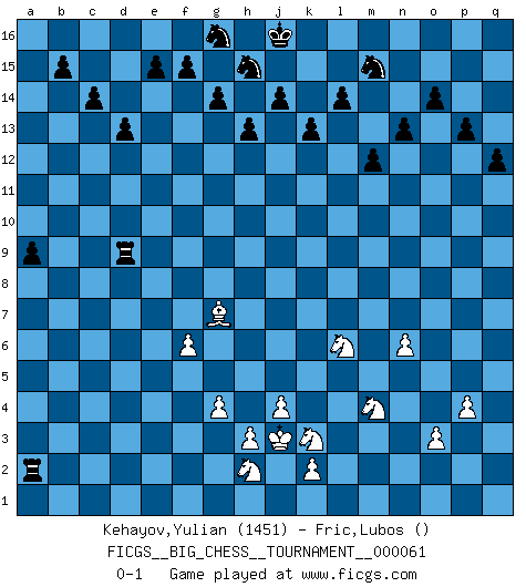 Last move : 0-1 2010 May 3 14:52:0 [Event "FICGS__BIG_CHESS__TOURNAMENT__000061"] [Site "FICGS"] [Date "2010.03.18"] [Round "1"] [White "Kehayov,Yulian"] [Black "Fric,Lubos"] [Result "0-1"] [WhiteElo "1451"] [BlackElo ""] 1.j2-h4 j15-h13 2.h1-o7 o15-o14 3.d2-d4 h16-l13 4.o7-k3 l13-o13 5.k3-c10 c15-c14 6.o2-o3 d15-d13 7.e2-e4 g15-g14 8.n2-n4 b16-d15 9.m2-m4 d15-f14 10.b1-c3 c16-f13 11.c10-g6 f13-k9 12.g6-l6 l15-l14 13.o1-g8 o13-n13 14.c1-e3 n13-p11 15.p2-p3 m15-m13 16.l1-o4 p11-b11 17.b2-b3 l16-q11 18.l6-k6 b11-l2 19.m1-m2 l2-l10 20.f1-d3 q11-o13 21.f2-f3 o13-n12 22.p1-n2 n15-n14 23.m2-m3 h13-j11 24.m3-l3 l10-o7 25.m4-m5 h14-h13 26.a1-d1 n12-q9 27.e4-e5 k9-d3 28.d1-d3 f16-p7 29.l3-k3 k15-k13 30.k6-n6 o7-n6 31.m5-n6 q9-n6 32.k3-k6 n6-k9 33.d3-d2 k9-p14 34.e3-k8 o16-l13 35.q1-l1 l13-p9 36.o4-m6 p9-q8 37.n4-n5 p7-n9 38.k6-h6 q8-o10 39.g2-g3 f14-g12 40.g1-j2 j11-l10 41.k8-g11 m16-m15 42.e1-e4 o10-n11 43.h4-k5 n11-h6 44.k5-h6 n9-m10 45.e4-h4 l10-m8 46.j2-k4 m8-k7 47.h2-j4 k7-j5 48.l1-l3 j5-g6 49.h4-g4 g6-j7 50.d2-d3 p14-d3 51.c2-d3 j7-g8 52.h6-g8 q15-q13 53.k1-h2 p16-n15 54.j1-j2 q13-q12 55.f3-f4 a15-a13 56.j4-h6 m10-h6 57.g8-h6 a13-a12 58.f4-f5 a12-a11 59.a2-a4 a16-a12 60.b3-b4 a12-c12 61.c3-b5 c12-c4 62.g11-a5 e16-a16 63.d4-d5 c4-g4 64.h6-g4 a16-a12 65.l3-l6 a12-d12 66.l6-d6 d12-d6 67.b5-d6 q16-q13 68.k4-l6 m13-m12 69.f5-f6 m15-m13 70.n2-m4 m13-l13 71.g4-j5 q13-o13 72.g3-g4 o13-p13 73.m6-l7 l13-l7 74.h2-k3 l7-q7 75.p3-p4 q7-q2 76.a5-b6 p13-p9 77.a4-a5 g12-e11 78.b6-c5 e11-d9 79.d6-b5 d9-b8 80.c5-n15 b8-a6 81.n15-d6 p9-c9 82.k3-h2 c9-c1 83.d6-f8 q2-q1 84.j5-k3 c1-b1 85.b5-c3 b1-b3 86.c3-e4 b3-d3 87.d5-d6 a6-b4 88.e4-g5 b4-c6 89.g5-f3 c6-a5 90.j3-j4 q1-a1 91.f8-g7 n14-n13 92.g7-j5 p15-p13 93.j5-f8 a1-a2 94.j2-j3 d3-e3 95.f8-n15 k16-m15 96.n15-f8 a5-c6 97.f8-h6 e3-e4 98.h6-g5 c6-e5 99.f3-e5 e4-e5 100.g5-h6 e5-e6 101.h6-g7 e6-d6 102.n5-n6 d6-d9 103.j3-j2 a11-a10 104.j2-j3 a10-a9 0-1 Follow this game move after move (download)Let the perfectionist play postal. (Yasser Seirawan) Capablanka war das größte Genie der Schachgeschichte! Aber denken sie nicht er habe nichts vom Schach verstanden. Er wusste nur soviel wie er wissen musste um seine Ziele zu erreichen. (Mikhail Moiseyevich Botvinik) Yo he agregado estos principios a la ley: pongan los Caballos en acción antes de que los dos Alfiles sean desarrollados. (Emanuel Lasker) Roi des jeux et jeu des rois, les échecs portent en eux un sentiment d'infini. Ils donnent à celui qui s'est efforcé d'en approfondir les arcanes l'impression de n'être pas à la mesure de l'homme; en fait, ils constituent un résumé de l'univers, un microcosme, et figurent cette grande échelle qui, dans les plans de la lumière descend jusqu'à la matière, qui des abîmes insondables remonte jusqu'en l'infini de Dieu. (Pyrame) Even the best needles are not sharp at both ends. (Chinese proverb)