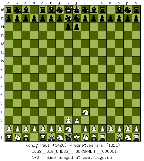 Last move : 1-0 2010 March 18 11:49:6 [Event "FICGS__BIG_CHESS__TOURNAMENT__000061"] [Site "FICGS"] [Date "2010.03.18"] [Round "1"] [White "Konig,Paul"] [Black "Gonet,Gerard"] [Result "1-0"] [WhiteElo "1420"] [BlackElo "1321"] 1.j2-k4 1-0 Follow this game move after move (download)The blunders are all there on the board, waiting to be made. (Savielly Tartakover) Die unerbitterlichsten Regeln im Schach sind die Ausnahmen. (Savielly Grigorievitsch Tartakower) La maestría del Ajedrez consiste esencialmente en analizar posiciónes de Ajedrez con precisión. (Mikhail Botvinnik) Tout change constamment, y compris dans le monde des Echecs. (Botvinnik) Secret operations are essential in war; upon them the army relies to make its every move. (Sun Tzu)