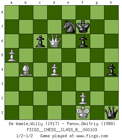 Last move : 1/2-1/2 2010 April 21 18:16:1 [Event "FICGS__CHESS__CLASS_B__000103"] [Site "FICGS"] [Date "2010.03.19"] [Round "1"] [White "De Waele,Willy"] [Black "Panov,Dmitriy"] [Result "1/2-1/2"] [WhiteElo "1917"] [BlackElo "1988"] 1.e4 e5 2.Nf3 Nf6 3.Nxe5 d6 4.Nf3 Nxe4 5.d4 d5 6.Bd3 Bd6 7.O-O O-O 8.c4 c6 9.Re1 Re8 10.Nc3 Nxc3 11.bxc3 dxc4 12.Bg5 Rxe1+ 13.Qxe1 Qf8 14.Bxc4 Nd7 15.Bd3 f6 16.Bd2 Qf7 17.c4 Nf8 18.h3 Be6 19.Qc1 Ng6 20.Qc2 Re8 21.Re1 Qd7 22.h4 Nf8 23.Bc3 Bf7 24.Rxe8 Bxe8 25.g3 Bg6 26.Bxg6 Nxg6 27.Qb3 Qe6 28.Kg2 b6 29.h5 Ne7 30.Qa4 Kf7 31.Bd2 Qd7 32.Qc2 Qf5 33.Qa4 b5 34.cxb5 Qxb5 35.Qxa7 Qxh5 36.a4 Qd5 37.Qd7 h5 38.a5 g5 39.Kf1 Qxf3 40.Qxd6 h4 41.gxh4 gxh4 42.Bb4 Qh1+ 1/2-1/2 Petrov : Classical attack, Marshall variation Kingside Castling by player White (move 7) Kingside Castling by player Black (move 7) This chess game ended in a draw. Follow this game move after move (download)You must take your opponent into a deep dark forest where 2+2=5, and the path leading out is only wide enough for one. (Mikhail Tal) Schach ist das schnellste Spiel der Welt, weil man in jeder Sekunde Tausende von Gedanken ordnen muß. (Albert Einstein) Solo puedes ser bueno en el Ajedrez si amas al juego. (Bobby Fischer) La vie et les Echecs sont tous les deux une lutte constante. (Lasker) When I took office, only high energy physicists had ever heard of what is called the World Wide Web... Now even my cat has its own page. (Bill Clinton, 1996)
