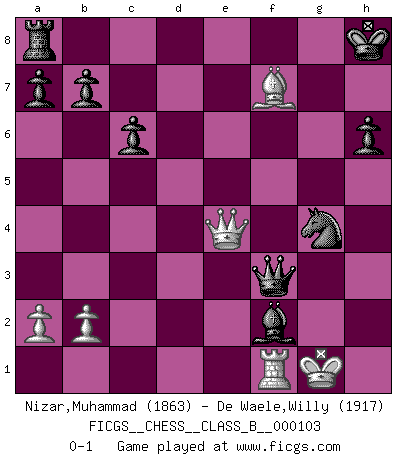 Last move : 0-1 2010 August 4 10:8:8 [Event "FICGS__CHESS__CLASS_B__000103"] [Site "FICGS"] [Date "2010.03.19"] [Round "1"] [White "Nizar,Muhammad"] [Black "De Waele,Willy"] [Result "0-1"] [WhiteElo "1863"] [BlackElo "1917"] 1.d4 d5 2.c4 c6 3.Nc3 Nf6 4.Nf3 e6 5.Bg5 h6 6.Bxf6 Qxf6 7.e3 Nd7 8.Bd3 dxc4 9.Bxc4 g6 10.O-O Bg7 11.Qc2 O-O 12.Ne4 Qe7 13.Bb3 e5 14.Ng3 Kh7 15.h4 Re8 16.h5 e4 17.Nd2 Nf6 18.f4 exf3 19.Rxf3 Bg4 20.hxg6+ fxg6 21.Rf2 Qxe3 22.Nf3 Bxf3 23.gxf3 Ng4 24.Bf7 Bxd4 25.Qxg6+ Kh8 26.Raf1 Qxf3 27.Ne4 Rxe4 28.Qxe4 Bxf2+ 0-1 This chess game has been lost on time (started : 2010.03.19 5:1:16) QGD Slav defense Kingside Castling by player White (move 10) Kingside Castling by player Black (move 11) Player Black won this chess game. Follow this game move after move (download)There are two types of sacrifices: correct ones and mine. (Mikhail Tal) Wenn sie aufgeben, dann danke ich Ihnen für das Spiel (Eventualzug beim Fernschach). (Anonymous) ¿Porque tengo que perder ante este idiota?. (Aron Nimzovich) Les échecs sont plus proches de l'art de l'assassinat que de l'art de la guerre. (Arturo Perez-Reverte) A mistake is only a mistake if you let it happen twice. Otherwise it is a learning experience. (Daniel Parmet)