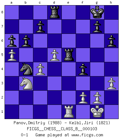 Last move : 0-1 2010 October 24 10:13:36 [Event "FICGS__CHESS__CLASS_B__000103"] [Site "FICGS"] [Date "2010.03.19"] [Round "1"] [White "Panov,Dmitriy"] [Black "Kelbl,Jiri"] [Result "0-1"] [WhiteElo "1988"] [BlackElo "1821"] 1.e4 e5 2.Nf3 Nc6 3.Bc4 Bc5 4.c3 Nf6 5.d3 d6 6.O-O O-O 7.b4 Bb6 8.a4 a6 9.a5 Ba7 10.Re1 h6 11.Nbd2 Re8 12.Nf1 Be6 13.Bxe6 Rxe6 14.Be3 Bxe3 15.Nxe3 Re8 16.h3 d5 17.Qc2 Qd7 18.exd5 Nxd5 19.Nxd5 Qxd5 20.Re3 Rad8 21.Rae1 Re6 22.Qb2 Rde8 23.Nd2 f5 24.Qb3 Rd8 25.Qxd5 Rxd5 26.Nb3 b6 27.d4 Re7 28.c4 Rd8 29.d5 f4 30.Re4 Nxb4 31.Rxe5 Rxe5 0-1 Giuoco Piano Kingside Castling by player White (move 6) Kingside Castling by player Black (move 6) Player Black won this chess game. Follow this game move after move (download)A player surprised is half beaten. (Proverb) Vom Schach wurde gesagt das Leben sei dafür nicht lange genug. Aber das ist der Fehler des Lebens, nicht des Schach'. (Irving Chernev) No es una movida, aún la mejor movida que tu debas buscar, sino un plan comprensible. (Eugene Znosko-Borovsky) Nous sommes les pions de la mystérieuse partie d'Echecs jouée par Dieu. Il nous déplace, nous arrête, nous pousse encore, puis nous lance un à un dans la boîte du Néant. Epitaphe sur la tombe de David Janowsky (1868-1927). But they are useless. They can only give you answers. (Pablo Picasso, about computers)