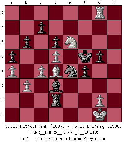 Last move : 0-1 2010 August 11 20:58:43 [Event "FICGS__CHESS__CLASS_B__000103"] [Site "FICGS"] [Date "2010.03.19"] [Round "1"] [White "Bullerkotte,Frank"] [Black "Panov,Dmitriy"] [Result "0-1"] [WhiteElo "1807"] [BlackElo "1988"] 1.d4 Nf6 2.c4 e6 3.Nc3 Bb4 4.Qc2 O-O 5.a3 Bxc3+ 6.Qxc3 b6 7.Bg5 Bb7 8.f3 h6 9.Bh4 d6 10.e3 Nbd7 11.Bd3 e5 12.Ne2 g5 13.Bg3 e4 14.fxe4 Nxe4 15.Bxe4 Bxe4 16.h4 Qe7 17.hxg5 hxg5 18.d5 Bh7 19.Kf1 Rae8 20.Bf2 Qe5 21.Kg1 Qxc3 22.Nxc3 a6 23.Ne2 Kg7 24.Nd4 Bd3 25.Rd1 Be4 26.b3 Nc5 27.Rf1 Rh8 28.Rxh8 Rxh8 29.Be1 Re8 30.Bd2 Bd3 31.Re1 Kg6 32.Bc3 f5 33.a4 a5 34.Bd2 Re4 35.Kf2 Rg4 36.Rg1 Kf6 37.Bc1 Be4 38.Kf1 Bb1 39.Bb2 Kg6 40.Rh1 Rg3 41.Ne6 Bd3+ 42.Kf2 Ne4+ 43.Kg1 Rxe3 44.Bd4 Re1+ 45.Kh2 Re2 46.Kg1 f4 47.Rh8 Kf5 48.Rg8 Rd2 0-1 Nimzo-Indian : Classical variation Kingside Castling by player Black (move 4) Player Black won this chess game. Follow this game move after move (download)Man is a frivolous, a specious creature, and like a Chess player, cares more for the process of attaining his goal than for the goal itself. (Dostoyevsky) Ich trinke, ich rauche, ich spiele, ich liebe Frauen aber Fernschach ist ein Laster, das ich nicht habe. (Mikhail Nekhemyevich Tal) Si un gobernante no entiende al Ajedrez, ¿como puede governar él un reinado?. (El Rey Khusros II) En blitz, le Cavalier l'emporte sur le Fou. (Vlastimil Hort) 98% of all statistics are made up. (Author unknown)