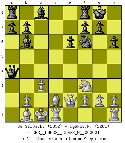 Last move : 0-1 2006 September 26 15:23:49 [Event "FICGS__CHESS__CLASS_M__000001"] [Site "FICGS"] [Date "2006.04.08"] [Round "1"] [White "De Silva,Dinesh"] [Black "Dyakov,Alexander"] [Result "0-1"] [WhiteElo "2392"] [BlackElo "2281"] 1.e4 c6 2.d4 d5 3.Nc3 dxe4 4.Nxe4 Nd7 5.Ng5 Ngf6 6.Bd3 e6 7.N1f3 Bd6 8.Qe2 h6 9.Ne4 Nxe4 10.Qxe4 Nf6 11.Qe2 c5 12.dxc5 Bxc5 13.Ne5 O-O 14.Bd2 Qd5 15.O-O-O Bd4 16.Nf3 Qxa2 17.c3 Bb6 18.Bb1 Qa4 0-1 This chess game has been lost on time (started : 2006.04.08 18:11:42) Caro-Kann : Steinitz variation Kingside Castling by player Black (move 13) Queenside Castling by player White (move 15) Player Black won this chess game. Follow this game move after move (download)It is not a move, even the best move that you must seek, but a realizable plan. (Eugene Znosko-Borovsky) Ich habe Kasparov in Rente geschickt. (Veselin Topalov) El Jaque al descubierto es el bombardero del tablero. (Reuben Fine) On est toujours la mazette de quelqu'un d'autre. (Anonyme) Wipe them out. All of them. (Darth Sidious in Star Wars ep.1)
