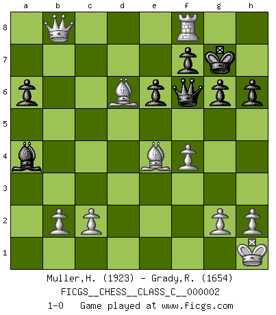 Last move : 1-0 2006 June 17 11:58:13 [Event "FICGS__CHESS__CLASS_C__000002"] [Site "FICGS"] [Date "2006.04.26"] [Round "1"] [White "Muller,Henri-Louis"] [Black "Grady,Richard"] [Result "1-0"] [WhiteElo "1923"] [BlackElo "1654"] 1.e4 c5 2.Nf3 d6 3.d4 cxd4 4.Nxd4 a6 5.Nc3 e6 6.Be3 Nc6 7.Be2 Bd7 8.O-O Be7 9.f4 Nf6 10.Qe1 O-O 11.Kh1 Rc8 12.a4 Nb4 13.Qd2 Nc6 14.Rad1 Nb4 15.Bf3 h6 16.Qf2 Nh7 17.e5 Rb8 18.exd6 Bxd6 19.Nf5 Be7 20.Nxe7+ Qxe7 21.Bc5 Qf6 22.Bxb4 Rfd8 23.Bd6 Nf8 24.Qb6 Rbc8 25.Bxb7 Rc4 26.Ne4 Rxe4 27.Bxe4 Bxa4 28.Be5 Rxd1 29.Rxd1 Qe7 30.Rd8 g6 31.Bd6 Qf6 32.Rxf8+ Kg7 33.Qb8 1-0 Sicilian Kingside Castling by player White (move 8) Kingside Castling by player Black (move 10) Player White won this chess game. Follow this game move after move (download)At this time Fischer is simply a level above all the best Chessplayers in the world. (John Jacobs) Gott hat gewollt, dass ich Champion werde. (Surab Azmajparaschvili) Una buena ofensiva y una buena defensa, comienzan ambas con un buen desarrollo. (Bruce A. Moon) La solitude du joueur d'Echecs à l'approche du mat est semblable à celle du condamné. (Francis Szpiner) Dave, my mind is going. I can feel it. (HAL 9000 in 2001, a space odyssey)