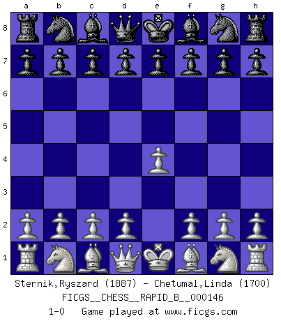 Last move : 1-0 2010 April 19 21:17:3 [Event "FICGS__CHESS__RAPID_B__000146"] [Site "FICGS"] [Date "2010.03.20"] [Round "1"] [White "Sternik,Ryszard"] [Black "Chetumal,Linda"] [Result "1-0"] [WhiteElo "1887"] [BlackElo "1700"] 1.e4 1-0 This chess game has been lost on time (started : 2010.03.20 16:55:30) King's pawn Opening Player White won this chess game. Follow this game move after move (download)Combinations have always been the most intriguing aspect of Chess. The masters look for them, the public applauds them, the critics praise them. It is because combinations are possible that Chess is more than a lifeless mathematical exercise. They are the poetry of the game; they are to Chess what melody is to music. They represent the triumph of mind over matter. (Reuben Fine) Oft bringt ein stiller Zug das Erdbeben. (Richard Reti) Botvinnik trató de alejar el misterio referente al Ajedrez, siempre relacionandolo a situaciones de la vida diaria. Solía llamar al Ajedrez un problema inexacto típico, similar a aquellos en que la gente tiene siempre que resolver a cada día. (Garry Kasparov) Soyez une menace à chaque fois que vous vous asseyez pour jouer. (Ken Smith) Every man's memory is his private literature. (Aldous Huxley)