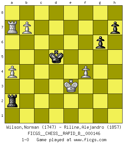 Last move : 1-0 2010 May 9 19:53:37 [Event "FICGS__CHESS__RAPID_B__000146"] [Site "FICGS"] [Date "2010.03.20"] [Round "1"] [White "Wilson,Norman"] [Black "Riline,Alejandro"] [Result "1-0"] [WhiteElo "1747"] [BlackElo "1857"] 1.e4 e5 2.Nf3 Nc6 3.Nc3 Be7 4.Bb5 d6 5.O-O Nf6 6.d4 exd4 7.Nxd4 Bd7 8.Bxc6 bxc6 9.Qf3 c5 10.Nf5 Bxf5 11.Qxf5 O-O 12.b3 Qc8 13.Qxc8 Raxc8 14.Bb2 Rfe8 15.Rfe1 Bf8 16.f3 Nd7 17.Rad1 g6 18.f4 Nb6 19.e5 Bg7 20.Ne4 Rcd8 21.a4 Nd7 22.exd6 Bxb2 23.dxc7 Rc8 24.Rxd7 f5 25.Rb1 Rxe4 26.Rxb2 Rd4 27.Re7 Re4 28.Rxe4 fxe4 29.Rb1 Rxc7 30.Re1 c4 31.b4 c3 32.Rxe4 Rd7 33.Rc4 Rd1+ 34.Kf2 Rd2+ 35.Ke3 Rxc2 36.b5 Rxg2 37.Rxc3 Rxh2 38.Rc8+ Kf7 39.Rc7+ Ke6 40.Rxa7 Kd5 41.b6 Ra2 42.b7 1-0 Three knights game Kingside Castling by player White (move 5) Kingside Castling by player Black (move 11) 10 pieces endgame at move 37 : White KRPPP , Black KRPPP WHITE : King + 1 Rook 3 Pawns BLACK : King + 1 Rook 3 Pawns 9 pieces endgame at move 40 : White KRPPP , Black KRPP WHITE : King + 1 Rook 3 Pawns BLACK : King + 1 Rook 2 Pawns Player White won this chess game. Follow this game move after move (download)The beauty of a move lies not in its' appearance but in the thought behind it. (Siegbert Tarrasch) Bobby Fischer ist kein Vorbild für die heutige Jugend. (Viktor Kortschnoi) El Ajedrez, como la música, como el amor, tiene el poder de hacer feliz a la gente. (Siegbert Tarrasch) Les pièces de l'échiquier étaient impitoyables. Elles le retenaient, elles l'absorbaient. Il y avait de l'horreur en cela, mais aussi une harmonie unique. Car, qu'y a-t-il dans le monde, à part les échecs ? (V. Nabokov) Perhaps the current trend of many chess professionals taking up the more lucrative pastime of poker is not a wholly negative one. It may not be too late for humans to relearn how to take risks in order to innovate and thereby maintain the advanced lifestyles we enjoy. And if it takes a poker-playing supercomputer to remind us that we can't enjoy the rewards without taking the risks, so be it. (The Chess Master and the Computer, by Garry Kasparov - 2010)