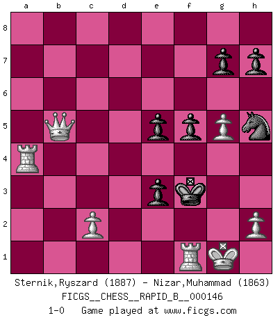 Last move : 1-0 2010 June 11 11:40:34 [Event "FICGS__CHESS__RAPID_B__000146"] [Site "FICGS"] [Date "2010.03.20"] [Round "1"] [White "Sternik,Ryszard"] [Black "Nizar,Muhammad"] [Result "1-0"] [WhiteElo "1887"] [BlackElo "1863"] 1.e4 c5 2.Nc3 d6 3.Nf3 Nf6 4.d4 cxd4 5.Nxd4 a6 6.Be3 e5 7.Nb3 Be6 8.f3 Be7 9.Qd2 Nbd7 10.g4 b5 11.a4 b4 12.Nd5 Bxd5 13.exd5 a5 14.Bb5 O-O 15.Bc6 Rc8 16.g5 Nh5 17.Bxd7 Qxd7 18.Nxa5 Rb8 19.Nc6 Rb7 20.a5 f6 21.a6 Rc7 22.Qxb4 Rxc6 23.dxc6 Qxc6 24.Qb7 Qe8 25.a7 Qa8 26.Qxe7 Qxf3 27.Qxf8+ Kxf8 28.a8Q+ Qxa8 29.Rxa8+ Kf7 30.b4 d5 31.b5 d4 32.b6 dxe3 33.b7 f5 34.b8Q Ke6 35.Ra6+ Kd5 36.Qb5+ Ke4 37.Ra4+ Kf3 38.O-O 1-0 Sicilian : Closed Kingside Castling by player Black (move 14) Promotion Queen by player White (move 28) Promotion Queen by player White (move 34) Kingside Castling by player White (move 38) Player White won this chess game. Follow this game move after move (download)Chess is the gymnasium of the mind. (Blaise Pascal) Vom Schach wurde gesagt das Leben sei dafür nicht lange genug. Aber das ist der Fehler des Lebens, nicht des Schach'. (Irving Chernev) Alekhine es un poeta que crea un trabajo de arte de algo que raramente inspiraría a otra persona a mandar una tarjeta postal. (Max Euwe) Le moment que je préfère le plus dans une rencontre, c'est celui où je sens que la personnalité de l'adversaire se brise. (Robert Fischer) Watch your thoughts; they become words. Watch your words; they become actions. Watch your actions; they become habits. Watch your habits; they become character. Watch your character; it becomes your destiny. (Frank Outlaw)