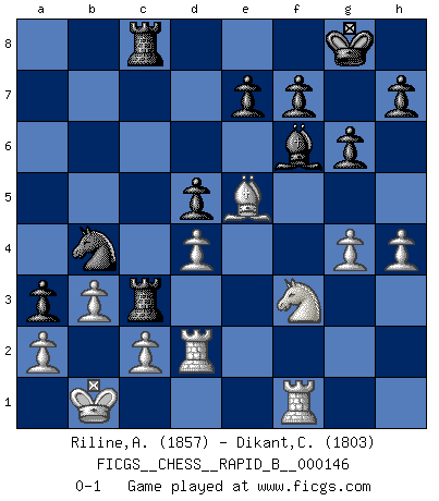 Last move : 0-1 2010 July 8 21:18:37 [Event "FICGS__CHESS__RAPID_B__000146"] [Site "FICGS"] [Date "2010.03.20"] [Round "1"] [White "Riline,Alejandro"] [Black "Dikant,Christophe"] [Result "0-1"] [WhiteElo "1857"] [BlackElo "1803"] 1.e4 g6 2.d4 Bg7 3.Nc3 c6 4.Be3 d5 5.f3 dxe4 6.fxe4 Nf6 7.Qd2 O-O 8.O-O-O b5 9.e5 b4 10.exf6 bxc3 11.Qxc3 Bxf6 12.Nf3 a5 13.h4 Be6 14.Bc4 Bxc4 15.Qxc4 Qd5 16.Qxd5 cxd5 17.g4 Nc6 18.Bf4 Rfc8 19.Kb1 a4 20.Be5 a3 21.b3 Nb4 22.Rd2 Rc3 23.Rf1 Rac8 0-1 This chess game has been lost on time (started : 2010.03.20 16:55:30) Robatsch defense Kingside Castling by player Black (move 7) Queenside Castling by player White (move 8) Player Black won this chess game. Follow this game move after move (download)Don't even mention losing to me. I can't stand to think of it. (Bobby Fischer) Offensichtlich kennt Kasparow nichts anderes als Schach, und ich könnte 500 weitere Spieler dieser Sorte benennen. (Judith Polgar) Bobby es la celebridad menos entendida y malinterpretada que camina el la faz de esta tierra. (Yasser Seirawan) Donnez-moi un Cavalier en 6e et je gagnerais toutes mes parties. (Steinitz) I've lost money so fast in these clubs it's left me reeling. I've read every poker book ever written, but the only way to get better at the game is to go out and play with people who are really good. The problem is, you stand to lose a lot of money doing it. (Matt Damon)