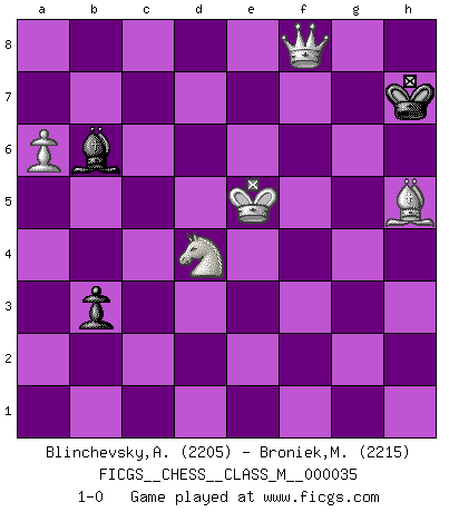 Last move : 1-0 2011 March 13 10:2:1 [Event "FICGS__CHESS__CLASS_M__000035"] [Site "FICGS"] [Date "2010.03.20"] [Round "1"] [White "Blinchevsky,Alexander"] [Black "Broniek,Mariusz Maciej"] [Result "1-0"] [WhiteElo "2205"] [BlackElo "2215"] 1.d4 Nf6 2.c4 e6 3.Nf3 d5 4.Nc3 Be7 5.Bg5 h6 6.Bh4 Nbd7 7.e3 O-O 8.Rc1 Re8 9.Bd3 dxc4 10.Bxc4 a6 11.a4 c5 12.O-O cxd4 13.exd4 b6 14.d5 b5 15.Ba2 Nf8 16.Ne5 Bb7 17.Qf3 Qb6 18.Bxf6 Bxf6 19.Nxf7 Kxf7 20.a5 Qa7 21.dxe6+ Nxe6 22.Ne4 Kf8 23.Qa3+ Be7 24.Qh3 Kg8 25.Qxe6+ Kh8 26.Ng3 Bf6 27.Qf7 Red8 28.Rce1 Bxg2 29.Qxa7 Rxa7 30.Kxg2 Bxb2 31.Re3 R7a8 32.Rfe1 Rac8 33.Rb3 Bd4 34.Bb1 Bc5 35.Re6 Rd6 36.Rbe3 Rf8 37.Rxd6 Bxd6 38.Nf5 Bc5 39.Re6 Rf6 40.Re8+ Rf8 41.Rxf8+ Bxf8 42.Nd4 Bc5 43.Nb3 Ba7 44.Be4 Kg8 45.Bb7 b4 46.Bxa6 Kf8 47.f4 Ke7 48.Kf3 g5 49.f5 Bb8 50.h3 Kf6 51.Ke4 Bc7 52.Bc4 h5 53.a6 Bb6 54.Be2 g4 55.hxg4 hxg4 56.Bxg4 Ba7 57.Nd4 Bc5 58.Bd1 Kf7 59.Ke5 Bb6 60.Bh5+ Kg7 61.f6+ Kh7 62.f7 b3 63.f8Q 1-0 Queen's pawn game Kingside Castling by player Black (move 7) Kingside Castling by player White (move 12) 10 pieces endgame at move 55 : White KBNPPP , Black KBPP WHITE : King + 1 Bishop 1 Knight 3 Pawns BLACK : King + 1 Bishop 2 Pawns 9 pieces endgame at move 55 : White KBNPP , Black KBPP WHITE : King + 1 Bishop 1 Knight 2 Pawns BLACK : King + 1 Bishop 2 Pawns 8 pieces endgame at move 56 : White KBNPP , Black KBP WHITE : King + 1 Bishop 1 Knight 2 Pawns BLACK : King + 1 Bishop 1 Pawn Promotion Queen by player White (move 63) Player White won this chess game. Follow this game move after move (download)Winning isn't everything... but losing is nothing. (Mednis) Schach ist ein Kampf gegen den Fehler. (Johannes Herrman Zukertort) Dios mío, Bobby Fischer juega tan simple. (Alexei Suetin) Je ne crois pas en la psychologie, je crois aux bons coups. (Robert Fischer) To be champion requires more than simply being a strong player; one has to be a strong human being as well. (Anatoly Karpov)
