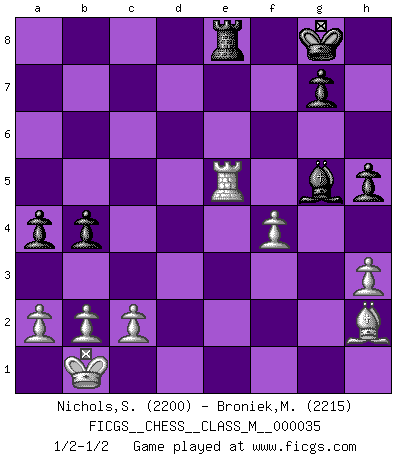 Last move : 1/2-1/2 2010 April 3 8:34:51 [Event "FICGS__CHESS__CLASS_M__000035"] [Site "FICGS"] [Date "2010.03.20"] [Round "1"] [White "Nichols,Scott"] [Black "Broniek,Mariusz Maciej"] [Result "1/2-1/2"] [WhiteElo "2200"] [BlackElo "2215"] 1.e4 c5 2.Nf3 d6 3.d4 cxd4 4.Nxd4 Nf6 5.Nc3 a6 6.Be3 e6 7.f3 b5 8.g4 h6 9.Qd2 b4 10.Nce2 e5 11.Nf5 d5 12.exd5 Qxd5 13.O-O-O Bb7 14.Bg2 Nbd7 15.Qxd5 Bxd5 16.Bg1 Rc8 17.Kb1 a5 18.h3 a4 19.Bh2 h5 20.g5 Be6 21.Ned4 exd4 22.Nxd4 Nd5 23.Rhe1 Be7 24.f4 N7b6 25.Nxe6 fxe6 26.Rxe6 Rd8 27.Rd3 O-O 28.Re5 Rfe8 29.Bxd5+ Rxd5 30.Rexd5 Nxd5 31.Rxd5 Bxg5 32.Re5 1/2-1/2 Sicilian : Najdorf, Byrne (English) attack Queenside Castling by player White (move 13) Kingside Castling by player Black (move 27) This chess game ended in a draw. Follow this game move after move (download)No price is too great for the scalp of the enemy King. (Koblentz) Jeder weiß, dass Gasprom Putins persönliches Machtinstrument ist. Die Firma wird vom Kreml aus geleitet und wird schon deshalb nie transparent sein. (Garry Kasparov) En partidas rápidas, el Caballo es mas poderoso que el Alfil. (Vlastimil Hort) La vérité est comme le meilleur coup aux échecs : elle existe, mais il faut la chercher. (Arturo Perez-Reverte) Pretend inferiority and encourage his arrogance. (Sun Tzu)