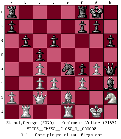 Last move : 0-1 2006 November 29 3:11:19 [Event "FICGS__CHESS__CLASS_A__000008"] [Site "FICGS"] [Date "2006.10.21"] [Round "1"] [White "Stibal,George"] [Black "Koslowski,Volker"] [Result "0-1"] [WhiteElo "2070"] [BlackElo "2169"] 1.c4 e5 2.Nc3 Nf6 3.e4 Nc6 4.Nf3 Bb4 5.d3 d6 6.Be2 O-O 7.O-O Bxc3 8.bxc3 Ne7 9.Be3 Ng6 10.Re1 c5 11.Qc2 Qe7 12.h3 Bd7 13.Nh2 h6 14.Rab1 b6 15.f3 Nh5 16.Nf1 Ngf4 17.Kh2 Bxh3 18.g4 Qh4 19.Kg1 Ng3 20.Bxf4 exf4 21.Nh2 Nxe4 0-1 English Opening Kingside Castling by player Black (move 6) Kingside Castling by player White (move 7) Player Black won this chess game. Follow this game move after move (download)All Chess players should have a hobby. (Savielly Tartakower) Wenn sie aufgeben, dann danke ich Ihnen für das Spiel (Eventualzug beim Fernschach). (Anonymous) Debemos de asegurarnos de que el Ajedrez no se convierta en un lenguaje muerto, muy interesante, pero tan solo para un grupo muy pequeño. (Sytze Faber) La conception d'un plan est le processus par lequel un joueur exploite les avantages de sa position tout en s'efforçant d'en réduire au minimum les inconvénients. Afin de garantir le succès, un plan doit toujours se fonder sur un diagnostic objectif des particularités d'une position. La conception d'un plan est d'autant plus difficile que la position est équilibrée, et grandement facilitée lorsqu'il n'existe qu'un seul plan susceptible de répondre aux exigences de la position. (Harry Golombek) I have opinions of my own - strong opinions - but I don't always agree with them. (George Bush)