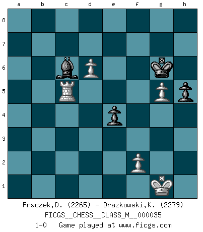 Last move : 1-0 2011 March 26 11:26:5 [Event "FICGS__CHESS__CLASS_M__000035"] [Site "FICGS"] [Date "2010.03.20"] [Round "1"] [White "Fraczek,Dariusz"] [Black "Drazkowski,Krzysztof"] [Result "1-0"] [WhiteElo "2265"] [BlackElo "2279"] 1.e4 c5 2.Nf3 Nc6 3.d4 cxd4 4.Nxd4 Nf6 5.Nc3 e5 6.Ndb5 d6 7.Bg5 a6 8.Na3 b5 9.Bxf6 gxf6 10.Nd5 Bg7 11.Bd3 Ne7 12.Nxe7 Qxe7 13.O-O O-O 14.c4 f5 15.Qf3 d5 16.cxd5 fxe4 17.Bxe4 Rb8 18.Rfd1 Qh4 19.g3 Qg5 20.Qb3 Bg4 21.Rdc1 f5 22.Bg2 e4 23.Rc2 Rbd8 24.Re1 Rf6 25.Nb1 Qh5 26.Rc7 Rh6 27.h4 Rhd6 28.Nd2 Bd4 29.a4 bxa4 30.Qc4 Bxb2 31.Qxa4 Bg7 32.Rb1 Qe8 33.Qa2 Kh8 34.R1b7 R6d7 35.Nc4 Rxc7 36.Rxc7 Qb5 37.Ne3 h5 38.Bf1 Qb6 39.Rc6 Qb7 40.Qa5 Rb8 41.Rxa6 Qd7 42.d6 Bf6 43.Qc7 Rb7 44.Qxd7 Rxd7 45.Bb5 Rg7 46.Nd5 Bxh4 47.Nf4 Kh7 48.Ne6 Rg8 49.gxh4 Be2 50.Ng5+ Rxg5+ 51.hxg5 Bxb5 52.Ra5 Bc6 53.Rxf5 Kg6 54.Rc5 1-0 Sicilian : Pelikan (Lasker/Sveshnikov) variation Kingside Castling by player White (move 13) Kingside Castling by player Black (move 13) 10 pieces endgame at move 51 : White KRPPP , Black KBPPP WHITE : King + 1 Rook 3 Pawns BLACK : King + 1 Bishop 3 Pawns 9 pieces endgame at move 53 : White KRPPP , Black KBPP WHITE : King + 1 Rook 3 Pawns BLACK : King + 1 Bishop 2 Pawns Player White won this chess game. Follow this game move after move (download)Best by test: 1. e4 (Bobby Fischer) Oft bringt ein stiller Zug das Erdbeben. (Richard Reti) Dios mío, Bobby Fischer juega tan simple. (Alexei Suetin) Un journaliste : 'Vous préférez avoir une dame de plus sur l'échiquier ou au lit ?' Boris Spassky : 'Ca dépend de la position.' The best teachers teach from the heart, not from the book. (Author unknown)