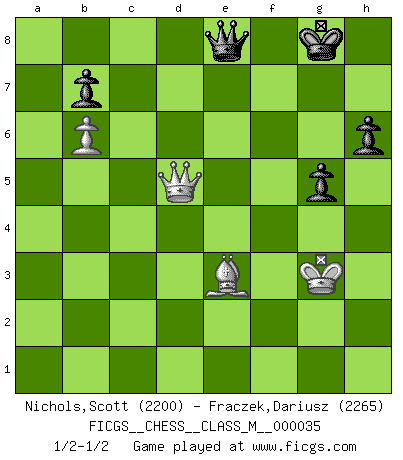 Last move : 1/2-1/2 2010 October 17 20:32:53 [Event "FICGS__CHESS__CLASS_M__000035"] [Site "FICGS"] [Date "2010.03.20"] [Round "1"] [White "Nichols,Scott"] [Black "Fraczek,Dariusz"] [Result "1/2-1/2"] [WhiteElo "2200"] [BlackElo "2265"] 1.e4 e6 2.d4 d5 3.Nd2 Nf6 4.e5 Nfd7 5.Bd3 c5 6.c3 Nc6 7.Ne2 cxd4 8.cxd4 f6 9.exf6 Nxf6 10.Nf3 Bd6 11.O-O Qc7 12.Bg5 O-O 13.Rc1 Bd7 14.a3 Be8 15.Ng3 h6 16.Be3 Qb6 17.Qe2 Bf7 18.Bb1 Rac8 19.h3 Qd8 20.b4 Qe7 21.Rfe1 a6 22.Qb2 Bb8 23.Ne5 Nxe5 24.dxe5 Nd7 25.f4 Kh8 26.Ne2 Bg8 27.Rxc8 Rxc8 28.Rc1 Rxc1+ 29.Qxc1 Qe8 30.Nd4 Bh7 31.Nf3 Bxb1 32.Qxb1 Nf8 33.Kf2 Ng6 34.h4 Ne7 35.g4 Kg8 36.h5 Qd7 37.Bc5 Bc7 38.Kg3 Nc6 39.a4 Bd8 40.b5 axb5 41.axb5 Ne7 42.Nd4 Qc8 43.Qc2 Kf7 44.b6 Kg8 45.f5 Nc6 46.Bd6 exf5 47.Qc5 Qa8 48.Qxd5+ Kh8 49.gxf5 Nxd4 50.Qxd4 Qa2 51.Bc5 Qb3+ 52.Qe3 Qd1 53.e6 Qxh5 54.e7 Bxe7 55.Qxe7 Qxf5 56.Be3 Qd5 57.Kf4 g5+ 58.Kg4 Kg8 59.Kg3 Qf7 60.Qd6 Qe8 61.Qd5+ 1/2-1/2 French : Tarrasch, Closed variation Kingside Castling by player White (move 11) Kingside Castling by player Black (move 12) 10 pieces endgame at move 55 : White KQBPP , Black KQPPP WHITE : King + 1 Queen 1 Bishop 2 Pawns BLACK : King + 1 Queen 3 Pawns 9 pieces endgame at move 55 : White KQBP , Black KQPPP WHITE : King + 1 Queen 1 Bishop 1 Pawn BLACK : King + 1 Queen 3 Pawns This chess game ended in a draw. Follow this game move after move (download)You must take your opponent into a deep dark forest where 2+2=5, and the path leading out is only wide enough for one. (Mikhail Tal) Das Schach hält seine Meister in eigenen Banden, Fesseln; auf vielerlei Weise formt es ihren Geist, so dass die innere Freiheit selbst des Stärksten beeinflusst wird. (Albert Einstein) El Ajedrez es un juego de pelea el cual es puramente intelectual e incluye la suerte. (Richard Reti) Il n'y a pas de prix trop élevé au scalp de l'ennemi. (Koblentz) When you have everything, sometimes it feels like nothing. (Horatio Caine, C.S.I. Miami)