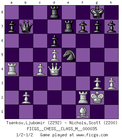 Last move : 1/2-1/2 2010 March 28 18:49:4 [Event "FICGS__CHESS__CLASS_M__000035"] [Site "FICGS"] [Date "2010.03.20"] [Round "1"] [White "Tsenkov,Ljubomir"] [Black "Nichols,Scott"] [Result "1/2-1/2"] [WhiteElo "2292"] [BlackElo "2200"] 1.c4 e5 2.Nc3 Nf6 3.Nf3 Nc6 4.g3 Bc5 5.Nxe5 Bxf2+ 6.Kxf2 Nxe5 7.e4 c5 8.d3 d6 9.Kg2 O-O 10.Be2 Be6 11.h3 Nc6 12.Bf4 Qe7 13.Qd2 Nd7 14.Nd5 Bxd5 15.exd5 Nd4 16.Rae1 Ne5 17.Rhf1 Rae8 18.Bg4 b6 19.Qc3 Qb7 20.Be3 Qa6 21.Bxd4 cxd4 22.Qxd4 b5 23.Be2 Qxa2 24.Ra1 Qb3 25.Rf2 bxc4 26.dxc4 Re7 27.Ra6 Rd8 28.Bf1 Qb7 29.Ra4 1/2-1/2 English Opening Kingside Castling by player Black (move 9) This chess game ended in a draw. Follow this game move after move (download)It is no time to be playing Chess when the house is on fire. (Italian Proverb) Alle Schachspieler sollten auch ein Hobby haben. (Savielly Grigorievitsch Tartakower) Cuando me preguntan: -¿Cual es el secreto que te hace hacer mejores movidas que tus oponentes?, Yo respondo: Me da gusto que me pregunten eso, porque, como veran, hay una simple razón. Yo pienso mis propias movidas y dejo a mi oponente que el piense las suyas. (Alexander Alekhine) Les Echecs, c'est l'art de la guerre sans les charniers, c'est la résurrection des morts tombés au champ d'honneur, l'espoir perpétuel, la suprématie de l'intelligence sur la force, la culture de l'esprit. (F. Szpiner) Man with more than one clock never knows what time it is. (Chinese thought)