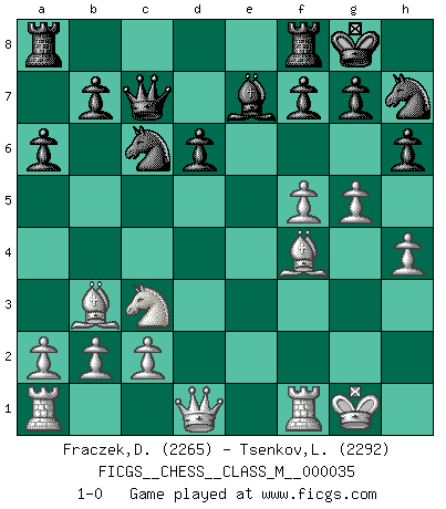 Last move : 1-0 2010 April 16 6:1:28 [Event "FICGS__CHESS__CLASS_M__000035"] [Site "FICGS"] [Date "2010.03.20"] [Round "1"] [White "Fraczek,Dariusz"] [Black "Tsenkov,Ljubomir"] [Result "1-0"] [WhiteElo "2265"] [BlackElo "2292"] 1.e4 c5 2.Nf3 d6 3.d4 cxd4 4.Nxd4 Nf6 5.Nc3 a6 6.Bc4 e6 7.Bb3 Be7 8.O-O O-O 9.Be3 Qc7 10.g4 h6 11.f4 e5 12.Nf5 Bxf5 13.exf5 exf4 14.Bxf4 Nc6 15.h4 Nh7 16.g5 1-0 Sicilian : Najdorf, Lipnitzky attack Kingside Castling by player White (move 8) Kingside Castling by player Black (move 8) Player White won this chess game. Follow this game move after move (download)Do you realize Fischer almost never has any bad pieces? He exchanges them, and the bad pieces remain with his opponents. (Yuri Balashov) Meine Liebe ist Schach, Schach, Schach. Ich muss jeden Tag Schach spielen, deshalb fühle ich mich so stark. (Miguel Najdorf) En la perfecta combinación de Ajedrez como en una historia corta de primera clase, toda la trama y contra trama deberá conducir hacia un final sorprendente, el interes no es mitigado hasta el último momento. (Yates and Winter) On n'a jamais que l'âge auquel on a commence à jouer aux échecs car après on cesse de vieillir. (Capablanca) Knowledge rests not upon truth alone, but upon error also. (Carl G. Jung)