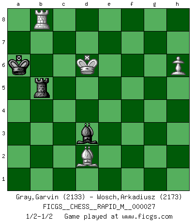 Last move : 1/2-1/2 2010 October 8 6:41:23 [Event "FICGS__CHESS__RAPID_M__000027"] [Site "FICGS"] [Date "2010.03.21"] [Round "1"] [White "Gray,Garvin"] [Black "Wosch,Arkadiusz"] [Result "1/2-1/2"] [WhiteElo "2133"] [BlackElo "2173"] 1.e4 c5 2.Nf3 Nc6 3.d4 cxd4 4.Nxd4 Nf6 5.Nc3 d6 6.Bg5 e6 7.Qd2 a6 8.O-O-O Bd7 9.Kb1 h6 10.Be3 b5 11.f3 Ne5 12.a3 Qa5 13.Nd5 Qxd2 14.Nxf6+ Kd8 15.Bxd2 gxf6 16.Be2 Nc4 17.Bxc4 bxc4 18.Ne2 Rg8 19.g4 Bc6 20.Bc3 Be7 21.Ng3 Kc7 22.Rhe1 a5 23.Rd4 Bb5 24.Red1 Kb7 25.Nh5 Rg6 26.h3 Ra6 27.Re1 Bd8 28.Rf1 Be7 29.Rfd1 Kb8 30.Re1 Bd8 31.Rd2 Bd7 32.Red1 Be7 33.Re2 Bd8 34.Rf2 Be7 35.Rd4 Bb5 36.Re2 Bd8 37.Ng3 Kc7 38.f4 Rg8 39.Nh5 Kb7 40.f5 Be7 41.fxe6 fxe6 42.Rd1 e5 43.Rf2 Bc6 44.Nxf6 Bxf6 45.Rxf6 Bxe4 46.Rxh6 Rf8 47.g5 d5 48.Bxe5 Rf2 49.Re1 Rxh6 50.gxh6 Bxc2+ 51.Kc1 Bd3 52.Re3 Rf1+ 53.Kd2 Rf2+ 54.Kc3 Bb1 55.b4 Kb6 56.bxa5+ Kb5 57.a4+ Kxa5 58.Kd4 Kxa4 59.Kxd5 Bd3 60.Rg3 Kb5 61.Rg8 Rf3 62.h4 Rh3 63.Bf6 c3 64.Rb8+ Ka6 65.Bxc3 Rxh4 66.Bd2 Rh5+ 67.Kd6 Rb5 1/2-1/2 Sicilian defense Queenside Castling by player White (move 8) 10 pieces endgame at move 58 : White KRBPP , Black KRBPP WHITE : King + 1 Rook 1 Bishop 2 Pawns BLACK : King + 1 Rook 1 Bishop 2 Pawns 9 pieces endgame at move 59 : White KRBPP , Black KRBP WHITE : King + 1 Rook 1 Bishop 2 Pawns BLACK : King + 1 Rook 1 Bishop 1 Pawn 8 pieces endgame at move 65 : White KRBPP , Black KRB WHITE : King + 1 Rook 1 Bishop 2 Pawns BLACK : King + 1 Rook 1 Bishop 7 pieces endgame at move 65 : White KRBP , Black KRB WHITE : King + 1 Rook 1 Bishop 1 Pawn BLACK : King + 1 Rook 1 Bishop This chess game ended in a draw. Follow this game move after move (download)The battle for the ultimate truth will never be won. And that's why Chess is so fascinating. (Hans Kmoch) Rauchen ist dem Schachspieler bei seiner Arbeit, also im Wettkampf, untersagt. (Viktor Kortschnoi) No todos los artistas son jugadores de Ajedrez, pero todos los jugadores de Ajedrez son artistas. (Marcel Duchamp) Si rien de grave n'est détecté lors de l'analyse d'une position, on joue alors le coup. Seconde règle de Blumenfeld. Unless I accept my faults I will most certainly doubt my virtues. (Hugh Prather)