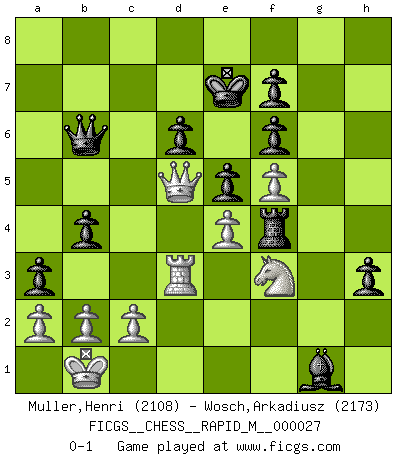 Last move : 0-1 2010 July 22 19:22:27 [Event "FICGS__CHESS__RAPID_M__000027"] [Site "FICGS"] [Date "2010.03.21"] [Round "1"] [White "Muller,Henri"] [Black "Wosch,Arkadiusz"] [Result "0-1"] [WhiteElo "2108"] [BlackElo "2173"] 1.e4 c5 2.Nf3 Nc6 3.d4 cxd4 4.Nxd4 Nf6 5.Nc3 d6 6.Bg5 e6 7.Qd2 a6 8.O-O-O Bd7 9.f4 b5 10.Bxf6 gxf6 11.Kb1 Qb6 12.Nxc6 Bxc6 13.Bd3 b4 14.Ne2 h5 15.f5 Bh6 16.Qe1 e5 17.Ng3 h4 18.Nf1 Bf4 19.Qe2 Ke7 20.Nd2 Rag8 21.Qf3 Rg5 22.Be2 Rd8 23.Rhe1 a5 24.Bc4 Bxh2 25.Rh1 Bg3 26.Qd3 Bf2 27.Rh2 a4 28.Bd5 Bxd5 29.Qxd5 Rg4 30.Nf3 Rdg8 31.Nd2 Qa6 32.R2h1 Rxg2 33.Nf3 R8g4 34.Rd3 Qb6 35.R3d1 a3 36.Rd2 Rf4 37.Rd3 Be3 38.Ne1 Rg1 39.Rxg1 Bxg1 40.Nf3 h3 0-1 Sicilian defense Queenside Castling by player White (move 8) Player Black won this chess game. Follow this game move after move (download)Of all my Russian books, the defense contains and diffuses the greatest 'warmth' which may seem odd seeing how supremely abstract Chess is supposed to be. (Vladimir Nabokov) Schach ist Kampf, hauptsächlich jedoch gegen die eigenen Fehler. (Savielly Grigorievitsch Tartakower) Con el fin de mejorar tu juego, debes de estudiar los finales antes que todo, ya que mientras que los finales pueden ser estudiados y dominados por sí mismos, el juegomedio y la apertura deben de ser estudiados en relación con los finales. (José Raúl Capablanca) Les Echecs mettent en conflit, non pas deux intelligences, mais deux volontés. (Lasker) Vladimir Ras-Putin is still alive... He is also a good actor, I saw him in the Lord of the Rings. (Rodolfo d'Ettorre)