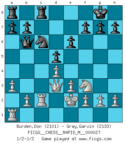 Last move : 1/2-1/2 2010 June 3 23:37:53 [Event "FICGS__CHESS__RAPID_M__000027"] [Site "FICGS"] [Date "2010.03.21"] [Round "1"] [White "Burden,Don"] [Black "Gray,Garvin"] [Result "1/2-1/2"] [WhiteElo "2101"] [BlackElo "2133"] 1.Nf3 d5 2.d4 Nf6 3.Bf4 Bf5 4.e3 e6 5.Bd3 Ne4 6.Nbd2 Bd6 7.Bxd6 cxd6 8.c4 Nxd2 9.Qxd2 Bxd3 10.Qxd3 dxc4 11.Qxc4 d5 12.Qb3 Qa5+ 13.Ke2 Qa6+ 14.Qd3 Qb6 15.Rhc1 O-O 16.Rc2 Nc6 17.a3 Rfc8 1/2-1/2 Reti Opening Kingside Castling by player Black (move 15) This chess game ended in a draw. Follow this game move after move (download)Chess problems demand from the composer the same virtues that characterize all worthwhile art: originality, invention, conciseness, harmony, complexity, and splendid insincerity. (Vladimir Nabokov) Jeder weiß, dass Gasprom Putins persönliches Machtinstrument ist. Die Firma wird vom Kreml aus geleitet und wird schon deshalb nie transparent sein. (Garry Kasparov) Las Aperturas te enseñan aperturas. ¡Los Finales te enseñan Ajedrez!. (Stephan Gerzadowicz) Le thème de l'attaque double intervient d'une manière ou d'une autre dans l'immense majorité des combinaisons. (Youri Averbakh) Some people are so afraid to die that they never begin to live. (Henry Van Dyke)