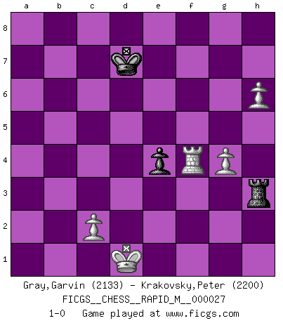 Last move : 1-0 2010 July 16 19:51:23 [Event "FICGS__CHESS__RAPID_M__000027"] [Site "FICGS"] [Date "2010.03.21"] [Round "1"] [White "Gray,Garvin"] [Black "Krakovsky,Peter"] [Result "1-0"] [WhiteElo "2133"] [BlackElo "2200"] 1.e4 c5 2.Nf3 d6 3.d4 cxd4 4.Nxd4 Nf6 5.Nc3 a6 6.Bg5 e6 7.f4 Qb6 8.Qd2 Qxb2 9.Rb1 Qa3 10.f5 Nc6 11.fxe6 fxe6 12.Nxc6 bxc6 13.Be2 Be7 14.O-O O-O 15.Rb3 Qc5+ 16.Be3 Qe5 17.Bf4 Nxe4 18.Nxe4 Qxe4 19.Bxd6 Rxf1+ 20.Kxf1 Bf6 21.Bf3 Qa4 22.Be5 Qc4+ 23.Ke1 Be7 24.Qf4 Qxf4 25.Bxf4 Bd7 26.Rb7 Rd8 27.Bc7 Rf8 28.Be5 Rd8 29.Ra7 Bf6 30.Bxf6 gxf6 31.Rxa6 e5 32.a4 e4 33.Be2 Kf7 34.a5 Ke6 35.Ra7 f5 36.a6 Kd6 37.g3 Rb8 38.Kd2 h6 39.Kc3 Rb1 40.Ra8 Kc7 41.Rh8 Bc8 42.Rxh6 Kb6 43.a7 Kxa7 44.Rxc6 Kb8 45.Kd4 Rg1 46.Ba6 Bxa6 47.Rxa6 Rd1+ 48.Ke3 Kc7 49.Rf6 Re1+ 50.Kd2 Rf1 51.h4 Kd7 52.g4 f4 53.Ke2 Rf3 54.h5 Re3+ 55.Kd1 Rf3 56.h6 Rh3 57.Rxf4 1-0 Sicilian : Najdorf, 7...Qb6 Kingside Castling by player White (move 14) Kingside Castling by player Black (move 14) 10 pieces endgame at move 46 : White KRPPP , Black KRBPP WHITE : King + 1 Rook 3 Pawns BLACK : King + 1 Rook 1 Bishop 2 Pawns 9 pieces endgame at move 47 : White KRPPP , Black KRPP WHITE : King + 1 Rook 3 Pawns BLACK : King + 1 Rook 2 Pawns 8 pieces endgame at move 57 : White KRPPP , Black KRP WHITE : King + 1 Rook 3 Pawns BLACK : King + 1 Rook 1 Pawn Player White won this chess game. Follow this game move after move (download)Chess is not like life... it has rules ! (Mark Pasternak) Ich habe die Schachforschung dermaßen betrieben, dass sie auf eine wissenschaftliche Basis gestellt wurde. (Mikhail Moiseyevich Botvinik) Solo el jugador con la iniciativa tiene el derecho a atacar. (Wilhelm Steinitz) Le système Elo représente seulement une moyenne. Il est simplement un indicateur de votre stabilité. (Anatoli Karpov) For to win one hundred victories in one hundred battles is not the acme of skill. To subdue the enemy without fighting is the acme of skill. (Sun Tzu)