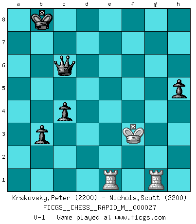 Last move : 0-1 2010 May 17 12:36:24 [Event "FICGS__CHESS__RAPID_M__000027"] [Site "FICGS"] [Date "2010.03.21"] [Round "1"] [White "Krakovsky,Peter"] [Black "Nichols,Scott"] [Result "0-1"] [WhiteElo "2200"] [BlackElo "2200"] 1.e4 d5 2.exd5 Qxd5 3.d4 Nc6 4.Nf3 Bg4 5.Be2 O-O-O 6.c4 Qf5 7.Nbd2 e6 8.O-O Nf6 9.Nb3 h6 10.h3 Bxh3 11.gxh3 Qxh3 12.Bf4 g5 13.Bh2 g4 14.Ne1 Rg8 15.Qd3 g3 16.fxg3 Bd6 17.Rxf6 Bxg3 18.Bxg3 Rxg3+ 19.Qxg3 Qxg3+ 20.Ng2 Nxd4 21.Nxd4 Qe5 22.Rxf7 Qxd4+ 23.Rf2 Qxb2 24.Re1 Qxa2 25.Bg4 Qa5 26.Rxe6 Kb8 27.Rf5 Qc3 28.Rd5 Rg8 29.Re3 Qc1+ 30.Re1 Qc2 31.Ne3 Qe4 32.Kf2 c6 33.Rf5 a5 34.Rxa5 Rxg4 35.Nxg4 Qf4+ 36.Ke2 Qxc4+ 37.Kf2 Qf4+ 38.Ke2 Qxg4+ 39.Kd3 b5 40.R5a1 Qc4+ 41.Ke3 b4 42.Rac1 Qb3+ 43.Kd2 h5 44.Rh1 Qd5+ 45.Ke3 c5 46.Rhd1 Qe6+ 47.Kf2 b3 48.Rg1 c4 49.Rce1 Qb6+ 50.Kf3 Qc6+ 0-1 Scandinavian (centre counter) defense Queenside Castling by player Black (move 5) Kingside Castling by player White (move 8) 10 pieces endgame at move 35 : White KRRNP , Black KQPPP WHITE : King + 2 Rooks 1 Knight 1 Pawn BLACK : King + 1 Queen 3 Pawns 9 pieces endgame at move 36 : White KRRN , Black KQPPP WHITE : King + 2 Rooks 1 Knight BLACK : King + 1 Queen 3 Pawns 8 pieces endgame at move 38 : White KRR , Black KQPPP WHITE : King + 2 Rooks BLACK : King + 1 Queen 3 Pawns Player Black won this chess game. Follow this game move after move (download)All my games are real. (Bobby Fischer) Heutzutage gewinnt im Turnier nicht derjenige Spieler, der weitreichende Pläne entwirft, sondern einfach jener, der Zug um Zug kämpft. (David Bronstein) El Ajedrez es imaginación. (David Bronstein) J'ai toujours senti une vague pitié pour l'homme qui ne connaît rien aux échecs, tout comme j'en aurais pour un homme ignorant de l'amour. Les Echecs, comme la musique ou comme l'amour, ont le pouvoir de rendre heureux. (Siegbert Tarrasch) Life is like a play: it's not the length but the excellence of the acting that matters. (Seneca)