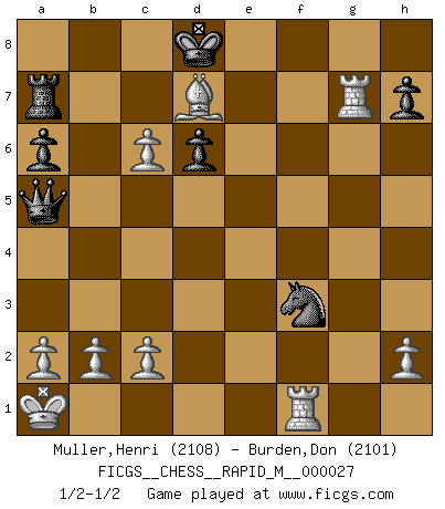 Last move : 1/2-1/2 2010 July 4 10:3:34 [Event "FICGS__CHESS__RAPID_M__000027"] [Site "FICGS"] [Date "2010.03.21"] [Round "1"] [White "Muller,Henri"] [Black "Burden,Don"] [Result "1/2-1/2"] [WhiteElo "2108"] [BlackElo "2101"] 1.e4 c5 2.Nf3 d6 3.d4 cxd4 4.Nxd4 Nf6 5.Nc3 a6 6.Bg5 e6 7.f4 Qc7 8.Qf3 Be7 9.O-O-O Nbd7 10.g4 b5 11.Bxf6 Nxf6 12.g5 Nd7 13.f5 Nc5 14.f6 gxf6 15.gxf6 Bf8 16.Rg1 b4 17.Nd5 exd5 18.exd5 Nd7 19.Nc6 Bb7 20.Bh3 Ne5 21.Rge1 Rg8 22.Qf4 Bxc6 23.dxc6 Rg6 24.Kb1 Bh6 25.Qxb4 Rxf6 26.Bd7+ Kd8 27.Qh4 Ke7 28.Rf1 Bg7 29.Rf4 Qa5 30.Rdf1 Ng6 31.Rxf6 Nxh4 32.Rxf7+ Kd8 33.Rxg7 Nf3 34.Ka1 Ra7 1/2-1/2 Sicilian : Najdorf, 7.f4 Queenside Castling by player White (move 9) This chess game ended in a draw. Follow this game move after move (download)As one by one I mowed them down, my superiority soon became apparent. (Jose Capablanca) Jeder Fehler erscheint unglaublich dumm, wenn andre ihn begehen. (Georg Christoph Lichtenberg) El Ajedrez es el arte del análisis. (Mikhail Botvinnik) On n'a jamais que l'âge auquel on a commence à jouer aux échecs car après on cesse de vieillir. (Capablanca) Men should grow up. - Yeah. And dogs should stop licking themselves. It's not gonna happen. (Gregory House to Dr. Cameron, House M.D.)