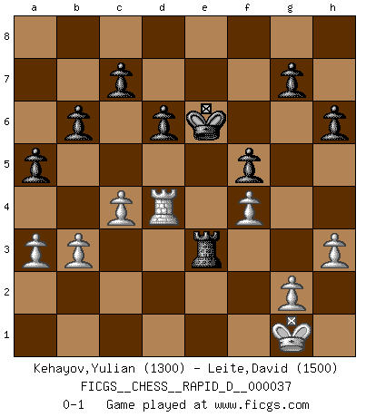 Last move : 0-1 2010 May 19 19:53:56 [Event "FICGS__CHESS__RAPID_D__000037"] [Site "FICGS"] [Date "2010.03.21"] [Round "1"] [White "Kehayov,Yulian"] [Black "Leite,David"] [Result "0-1"] [WhiteElo "1300"] [BlackElo "1500"] 1.c4 e5 2.d4 exd4 3.Qxd4 Nc6 4.Qd1 Nf6 5.Nc3 Bb4 6.Bd2 O-O 7.e3 d6 8.Nf3 Bg4 9.a3 Bxc3 10.Bxc3 Ne4 11.Rc1 Re8 12.h3 Bh5 13.Be2 Nxc3 14.Rxc3 Qf6 15.O-O Re4 16.Rc2 a5 17.b3 Rae8 18.Qd3 Bg6 19.Qc3 Qxc3 20.Rxc3 b6 21.Rfc1 R4e6 22.Bf1 h6 23.Be2 Bh7 24.Bd3 Bxd3 25.Rxd3 Ne5 26.Nxe5 Rxe5 27.Rcd1 f5 28.Rd5 Kf7 29.Rxe5 Rxe5 30.Rd4 Ke6 31.f4 Rxe3 0-1 English Opening Kingside Castling by player Black (move 6) Kingside Castling by player White (move 15) Player Black won this chess game. Follow this game move after move (download)I look one move ahead... the best ! (Siegbert Tarrasch) Alles was ich jemals tun will ist Schach spielen. (Robert James Fischer) No es tiempo de jugar al Ajedrez cuando la casa esta en llamas. (Proverbio Italiano) J'ai vu le vaincu d'Echecs jouer des années durant dans l'espoir de la fête de la victoire. Car tu es plus riche de ce qu'elle existe si même elle n'est point pour toi. Ainsi de la perle du fond des mers. (Antoine de Saint-Exupéry) The mind is like a parachute, it only functions when its open. (Unknown)