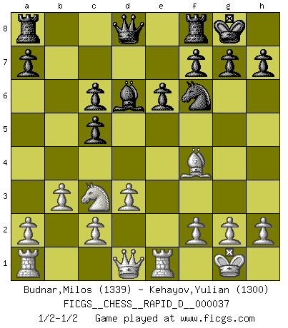 Last move : 1/2-1/2 2010 April 15 14:13:39 [Event "FICGS__CHESS__RAPID_D__000037"] [Site "FICGS"] [Date "2010.03.21"] [Round "1"] [White "Budnar,Milos"] [Black "Kehayov,Yulian"] [Result "1/2-1/2"] [WhiteElo "1339"] [BlackElo "1300"] 1.e4 c5 2.Nf3 d5 3.Bb5+ Bd7 4.Bxd7 Qxd7 5.exd5 Qxd5 6.O-O e6 7.d3 Nf6 8.Re1 Be7 9.Ne5 O-O 10.Bf4 Nc6 11.Nc3 Qd8 12.Nxc6 bxc6 13.b3 Bd6 1/2-1/2 Sicilian defense Kingside Castling by player White (move 6) Kingside Castling by player Black (move 9) This chess game ended in a draw. Follow this game move after move (download)Live, lose, and learn, by observing your opponent how to win. (Amber Steenbock) Es hat in meinem Leben Zeiten gegeben, da ich sehr nahe daran war zu glauben, daß ich auch nicht eine einzige Schachpartie verlieren könnte. (José Raúl Capablanca) Combinaciones deslumbrantes son para la mayoría, mover madera es para los pocos. (Georg Kieninger) Le joueur d'Echecs qui veut atteindre le top est obligé de développer son propre credo créatif. Alexeï Stepanovicth Souétine. Il est facile d'écrire des livres ! Ce qui est difficile, c'est de jouer ! (Alexeï Stepanovicth Souétine) Programming can only do so much before it becomes too much. (Don Groves)