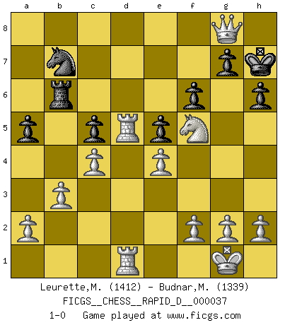 Last move : 1-0 2010 May 21 19:19:19 [Event "FICGS__CHESS__RAPID_D__000037"] [Site "FICGS"] [Date "2010.03.21"] [Round "1"] [White "Leurette,Marc-Antoine"] [Black "Budnar,Milos"] [Result "1-0"] [WhiteElo "1412"] [BlackElo "1339"] 1.e4 e5 2.Nf3 Nc6 3.Bc4 Nf6 4.Ng5 d5 5.exd5 Na5 6.Bb5+ c6 7.dxc6 bxc6 8.Qf3 Bd7 9.Ba4 Rb8 10.d3 Rb4 11.b3 Rb6 12.Bd2 Bb4 13.c3 Bd6 14.c4 Bb4 15.Bxb4 Rxb4 16.Nd2 h6 17.Nge4 Nxe4 18.dxe4 c5 19.O-O O-O 20.Bxd7 Qxd7 21.Qe3 Nb7 22.Rad1 Qe7 23.Nf3 Rb6 24.Rd5 f6 25.Nh4 Kh7 26.Nf5 Qc7 27.Rfd1 Rf7 28.Qh3 Qc8 29.Qh5 a5 30.Qxf7 Qg8 31.Qxg8+ 1-0 Two knights defense Kingside Castling by player White (move 19) Kingside Castling by player Black (move 19) Player White won this chess game. Follow this game move after move (download)If your opponent cannot do anything active, then don't rush the position; instead you should let him sit there, suffer, and beg you for a draw. (Jeremy Silman) Ich war zu klein für die Schach-Schülermannschaft! (Woody Allen) No soy una persona materialista y por eso, no resiento la falta o pérdida del dinero. La ausencia de cosas mundanas carece de importancia. Ya que el Ajedrez es una forma en la que puedo ser tan materialista como yo desee sin tener la necesidad de vender mi alma. (Jamie Walter Adams) L'attaque fait le spectacle, la défense gagne les matchs. (Dicton footballistique) It's not enough to succeed. Others must fail. (Gore Vidal)