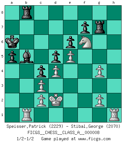Last move : 1/2-1/2 2007 January 21 4:35:27 [Event "FICGS__CHESS__CLASS_A__000008"] [Site "FICGS"] [Date "2006.10.21"] [Round "1"] [White "Speisser,Patrick"] [Black "Stibal,George"] [Result "1/2-1/2"] [WhiteElo "2229"] [BlackElo "2070"] 1.e4 e6 2.d4 d5 3.Nc3 Bb4 4.e5 c5 5.a3 Bxc3+ 6.bxc3 Ne7 7.Nf3 b6 8.Bb5+ Bd7 9.Bd3 Ba4 10.O-O c4 11.Be2 h6 12.Nh4 g5 13.Nf3 Kd7 14.Ne1 Qg8 15.f4 Nbc6 16.fxg5 hxg5 17.Bg4 Qh7 18.h3 Rag8 19.Bd2 Rg7 20.Ra2 Nf5 21.Nf3 Rhg8 22.Nh2 Ng3 23.Re1 Kc8 24.Bf3 Rh8 25.Ng4 Nh5 26.Qc1 Qg6 27.Bd1 Kb7 28.Rb2 Ng3 29.Nf6 Ne7 30.Rb4 Bc6 31.Bf3 Ng8 32.Ng4 Nh6 33.Qb2 Kc7 34.Nf6 Rb8 35.Qc1 Nhf5 36.Be3 Nh4 37.Bg4 Ne4 38.Bh5 Qh6 39.Nxe4 Qxh5 40.Nf6 Qg6 41.a4 a5 42.Rb2 Nf5 43.Qa1 g4 44.hxg4 Nxe3 45.Rxe3 Qg5 46.Rh3 Qd2 47.Kf1 Kb7 48.Ra2 Ka6 49.Qe1 Qxe1+ 50.Kxe1 b5 51.axb5+ Rxb5 52.Ra1 Rb6 53.Kd2 Rb8 54.R3h1 Bb5 55.Rab1 1/2-1/2 French : Winawer, Advance, positional Main line Kingside Castling by player White (move 10) This chess game ended in a draw. Follow this game move after move (download)When you don't know what to play, wait for an idea to come into your opponent's mind. You may be sure that idea will be wrong. (Siegbert Tarrasch) Ich kämpfe solange mein Gegner einen Fehler machen kann. (Emanuel Lasker) El Ajedrez es realmente noventa y nueve por ciento calculación. (Soltis) La vie et les Echecs sont tous les deux une lutte constante. (Lasker) Perseverance does not equal worthiness. Next time you want to get my attention, wear something fun. Low-riding jeans are hot. (Gregory House, House M.D.)