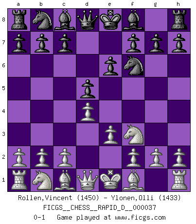 Last move : 0-1 2010 May 3 19:46:3 [Event "FICGS__CHESS__RAPID_D__000037"] [Site "FICGS"] [Date "2010.03.21"] [Round "1"] [White "Rollen,Vincent"] [Black "Ylonen,Olli"] [Result "0-1"] [WhiteElo "1450"] [BlackElo "1433"] 1.d4 d5 2.Nf3 Nf6 3.e3 e6 0-1 This chess game has been lost on time (started : 2010.03.21 13:38:56) Queen's pawn game Player Black won this chess game. Follow this game move after move (download)When I have White, I win because I am white; When I have Black, I win because I am Bogolyubov. (Bogolyubov) Schach ist Kampf, hauptsächlich jedoch gegen die eigenen Fehler. (Savielly Grigorievitsch Tartakower) El jugador táctico sabe que hacer cuando hay algo que hacer; mientras que el estratega sabe que hacer cuando no hay nada que hacer. (Gerald Abrahams) Vouloir jouer aux échecs contre soi-même est aussi paradoxal que vouloir marcher sur son ombre. (Stefan Zweig) I would love to change the world, but they won't give me the source code. (Unknown)