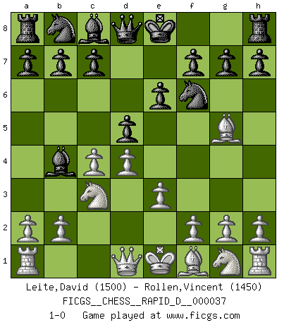 Last move : 1-0 2010 April 25 21:32:7 [Event "FICGS__CHESS__RAPID_D__000037"] [Site "FICGS"] [Date "2010.03.21"] [Round "1"] [White "Leite,David"] [Black "Rollen,Vincent"] [Result "1-0"] [WhiteElo "1500"] [BlackElo "1450"] 1.c4 e6 2.Nc3 d5 3.d4 Nf6 4.Bg5 Bb4 5.e3 1-0 This chess game has been lost on time (started : 2010.03.21 13:38:56) English Opening Player White won this chess game. Follow this game move after move (download)No one ever won a game by resigning. (Unknown) Wenn man heute mit 14 Jahren noch kein GM ist, kann man es vergessen. (Viswanathan Anand) Por esta medida (el intervalo entre Fischer y sus contemporaneos), yo le considero el mas grande campeón mundial. (Garry Kasparov) Les sacrifices démontrent seulement que quelqu'un a gaffé. (Savielly Tartacover) When the going gets tactical, the computers get going. (Hyatt)