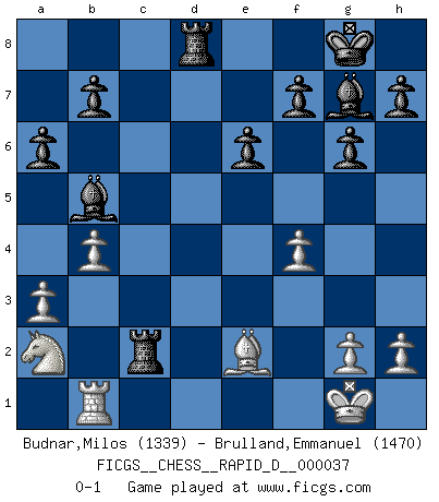 Last move : 0-1 2010 April 21 17:35:35 [Event "FICGS__CHESS__RAPID_D__000037"] [Site "FICGS"] [Date "2010.03.21"] [Round "1"] [White "Budnar,Milos"] [Black "Brulland,Emmanuel"] [Result "0-1"] [WhiteElo "1339"] [BlackElo "1470"] 1.e4 c6 2.d4 d5 3.Nc3 e6 4.Nf3 Nd7 5.e5 a6 6.a3 c5 7.Be3 g6 8.dxc5 Nxc5 9.Bxc5 Bxc5 10.b4 Bf8 11.Be2 Bg7 12.O-O Ne7 13.Na2 Nc6 14.c3 Nxe5 15.Nxe5 Bxe5 16.f4 Bg7 17.Rb1 O-O 18.Qd3 Bd7 19.c4 dxc4 20.Qxc4 Bb5 21.Qc2 Rc8 22.Rfd1 Rxc2 23.Rxd8 Rxd8 0-1 Caro-Kann defense Kingside Castling by player White (move 12) Kingside Castling by player Black (move 17) Player Black won this chess game. Follow this game move after move (download)Your body has to be in top condition. Your Chess deteriorates as your body does. You can't separate body from mind. (Bobby Fischer) Ich verachte die Medien. (Robert James Fischer) Morphy probablemente fue el genio más grande de todos. (Bobby Fischer) Vous savez, camarade Pachman, je n'éprouve pas de plaisir à être ministre, je jouerais plutôt aux échecs comme vous, ou alors ferais une révolution au Venezuela. (Che Guevara à Ludek Pachman, 'Checkmate in Prague', 1975) Information on the Internet is subject to the same rules and regulations as conversation at a bar. (George Lundberg)