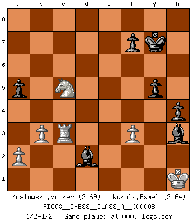 Last move : 1/2-1/2 2007 April 6 9:31:38 [Event "FICGS__CHESS__CLASS_A__000008"] [Site "FICGS"] [Date "2006.10.21"] [Round "1"] [White "Koslowski,Volker"] [Black "Kukula,Pawel"] [Result "1/2-1/2"] [WhiteElo "2169"] [BlackElo "2164"] 1.d4 Nf6 2.c4 g6 3.Nc3 Bg7 4.e4 d6 5.Be2 O-O 6.Nf3 Nbd7 7.O-O e5 8.Be3 Re8 9.Qc2 exd4 10.Nxd4 c6 11.Rad1 Qe7 12.f3 a5 13.Rfe1 Nc5 14.Kh1 Nh5 15.g4 Nf6 16.Qd2 h5 17.g5 Nfd7 18.b3 Nf8 19.Bf1 Rd8 20.e5 Bxe5 21.Nxc6 bxc6 22.Bxc5 Bf5 23.Bb6 Rdb8 24.c5 Ne6 25.Na4 Rd8 26.Bxd8 Rxd8 27.Qe3 Qf8 28.cxd6 Bf4 29.Qf2 Rxd6 30.Nb2 Nxg5 31.Bd3 Be6 32.Bc4 Rxd1 33.Rxd1 Bf5 34.Qe2 Bc7 35.Na4 Nh3 36.Qe3 Bf4 37.Qe1 Qb8 38.Bf1 Kg7 39.Bxh3 Bxh3 40.Qc3+ Be5 41.Qe3 Bf5 42.Qb6 Bxh2 43.Qxb8 Bxb8 44.Rc1 Be6 45.Nb6 h4 46.Rxc6 Ba7 47.Nd7 Be3 48.Rc3 Bf4 49.Rd3 g5 50.Nc5 Bh3 51.Rc3 Bd2 1/2-1/2 King's Indian : 5.Be2 Kingside Castling by player Black (move 5) Kingside Castling by player White (move 7) This chess game ended in a draw. Follow this game move after move (download)No one ever won a game by resigning. (Unknown) Ich verachte Kasparow. (Viktor Kortschnoi) El juego de Fischer siempre fue nítido, racional y brillante. Uno de los mejores por siempre. (Dave Regis) Les Echecs représentent une sphère d'idées créatrices basée sur la volonté des deux protagonistes. (Smyslov) There are more things in heaven and earth than practically anywhere else. (Unknown)