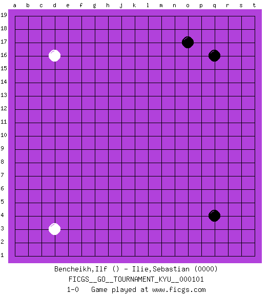 Last move : 1-0 2010 April 30 7:38:30 [Event "FICGS__GO__TOURNAMENT_KYU__000101"] [Site "FICGS"] [Date "2010.03.23"] [Round "1"] [Black "Bencheikh,Ilf"] [White "Ilie,Sebastian"] [Result "1-0"] [Rating 2 "0000"] 1.q4 d3 2.q16 d16 3.o17 1-0 This go game has been lost on time (started : 2010.03.23 10:58:32) Here are the names of the openings (joseki) played in the four corners : Corner q4 : q4 1-0 Hoshi (Hwajeom, Seongjeom, Xingwei`) 4-4 Point. The star or hoshi (4-4) point, emphasizing influence at the potential expense of territory. Player Black won this Go (weiqi, baduk) game. Follow this game move after move (download)Balance is not what players strike for, and if it does arise, it is in spite of them. (Pierre Audouard) Computer Science is no more about computers than astronomy is about telescopes. (Edsger W. Dijkstra)
