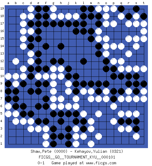 Last move : 0-1 2010 August 14 19:38:38 [Event "FICGS__GO__TOURNAMENT_KYU__000101"] [Site "FICGS"] [Date "2010.03.23"] [Round "1"] [Black "Shaw,Pete"] [White "Kehayov,Yulian"] [Result "0-1"] [Rating 1 "0000"] [Rating 2 "0321"] 1.e16 r5 2.e4 q16 3.k10 c16 4.e18 c18 5.d10 p4 6.k4 o17 7.q10 o13 8.k16 l17 9.k17 q12 10.n13 o14 11.n14 n15 12.m15 n16 13.o12 p12 14.p11 d4 15.d5 c4 16.c5 b5 17.c6 e3 18.f4 f3 19.o11 r11 20.l16 m17 21.m16 c14 22.h14 d12 23.e12 d13 24.f14 c11 25.d11 c10 26.c9 n5 27.d8 q7 28.b8 o8 29.o9 m8 30.m9 l8 31.n8 n7 32.n9 m7 33.h2 m3 34.h4 l5 35.k5 k6 36.l4 m4 37.p8 o7 38.k8 k7 39.j7 j6 40.f19 j8 41.k9 h7 42.q8 r8 43.p7 p6 44.r16 r15 45.q15 r17 46.s16 q14 47.p15 s15 48.r14 s14 49.q17 s17 50.p16 t16 51.q16 r13 52.p18 o18 53.r18 s18 54.s19 t17 55.q19 o15 56.o19 n19 57.o16 p14 58.t18 t15 59.l18 m18 60.l19 m19 61.r9 r7 62.s10 k18 63.t9 t8 64.s8 s7 65.s9 t7 66.d17 c17 67.d15 c15 68.g3 f2 69.g2 f1 70.g1 d3 71.e6 g9 72.j11 f10 73.f11 g11 74.g12 h11 75.h12 h10 76.j10 j9 77.j5 g6 78.f7 g7 79.f6 g8 80.g5 s11 81.e8 e10 82.e11 k2 83.l3 l2 84.m2 n2 85.b7 j18 86.j17 h18 87.h17 g18 88.f18 g19 89.g17 d18 90.f17 b10 91.a9 a10 92.j2 k3 93.j3 m1 94.d14 b4 95.b6 a6 96.a7 a5 97.q4 q3 98.r4 q5 99.s4 r3 100.s3 s2 101.j1 k1 102.e13 b12 103.f9 s5 104.l12 d19 105.e9 g10 106.l9 b9 107.a8 t11 108.r10 q11 109.p10 p17 110.n17 q18 111.n18 p19 112.m18 n19 113.l17 d16 114.e17 h6 115.h5 pass 116.e19 pass 117.m19 o19 118.e15 pass 0-1 Here are the names of the openings (joseki) played in the four corners : Corner d16 : e16 c16 Takamoku (Gomok, Gaomu`) 5-4 Point. The takamoku (high) point (5-4). With its emphasis on influence, the 5-4 point complements the 4-4 (hoshi) point in creating an influence-oriented fuseki. Komoku. Black responds with 3-3, 3-5, 4-6, 4-7, 3-6, 3-7. Corner d4 : e4 d4 Takamoku (Gomok, Gaomu`) 5-4 Point. The takamoku (high) point (5-4). With its emphasis on influence, the 5-4 point complements the 4-4 (hoshi) point in creating an influence-oriented fuseki. Player White won this Go (weiqi, baduk) game. Follow this game move after move (download)You can hide nothing on the goban. (Pierre Audouard) Employ the attack like tactic of defense. (Chinese proverb)