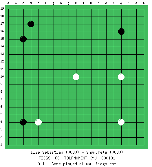 Last move : 0-1 2010 April 30 7:38:30 [Event "FICGS__GO__TOURNAMENT_KYU__000101"] [Site "FICGS"] [Date "2010.03.23"] [Round "1"] [Black "Ilie,Sebastian"] [White "Shaw,Pete"] [Result "0-1"] [Rating 1 "0000"] [Rating 2 "0000"] 1.q16 e4 2.c15 q4 3.d17 q10 4.c4 k10 0-1 This go game has been lost on time (started : 2010.03.23 10:58:32) Here are the names of the openings (joseki) played in the four corners : Corner d4 : e4 c4 Takamoku (Gomok, Gaomu`) 5-4 Point. The takamoku (high) point (5-4). With its emphasis on influence, the 5-4 point complements the 4-4 (hoshi) point in creating an influence-oriented fuseki. Komoku. White responds with 3-3, 3-5, 4-6, 4-7, 3-6, 3-7. Player White won this Go (weiqi, baduk) game. Follow this game move after move (download)Learn the eye-stealing tesuji. (Anonymous) Real knowledge is to know the extent of one's ignorance. (Confucius)
